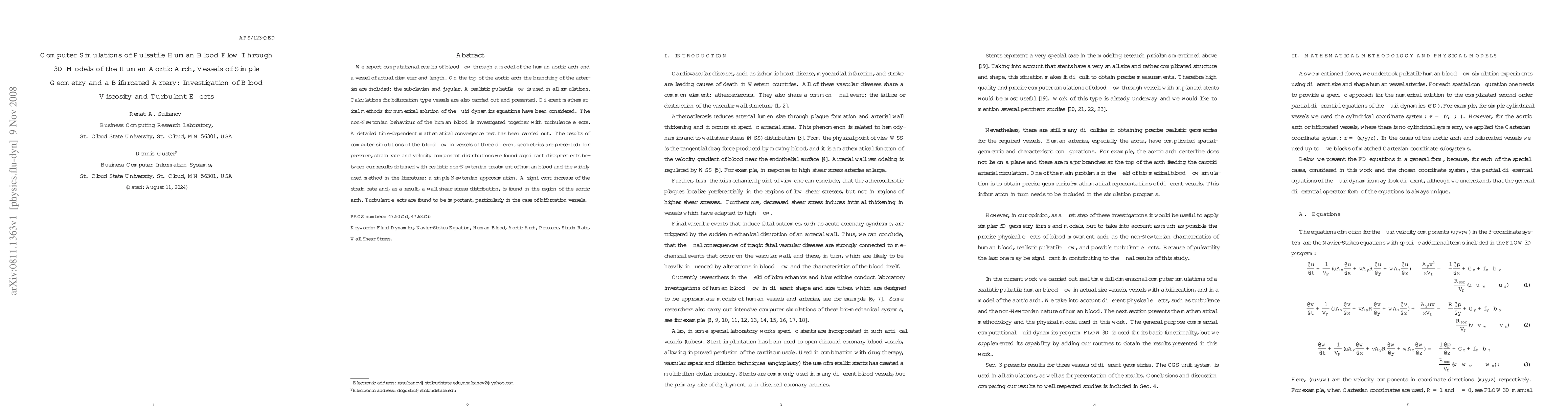 This study investigates pulsatile blood flow through 3D models of the human aortic arch and bifurcated arteries using computational fluid dynamics, focusing on the non-Newtonian behavior of blood and turbulent effects. Results show significant differences between non-Newtonian simulations and Newtonian approximations, highlighting increased strain rate and wall shear stress in the aortic arch region.