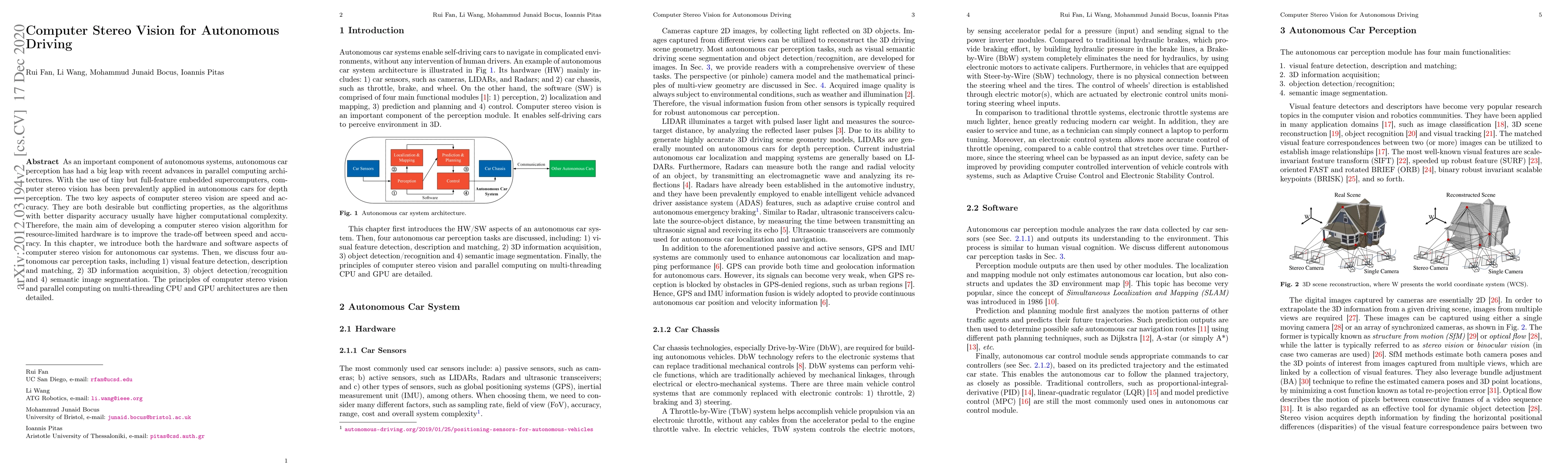 This paper explores the integration of computer stereo vision in autonomous driving, emphasizing the balance between speed and accuracy in perception tasks. It covers hardware and software aspects, detailing four key perception tasks and the principles of parallel computing for optimal performance.