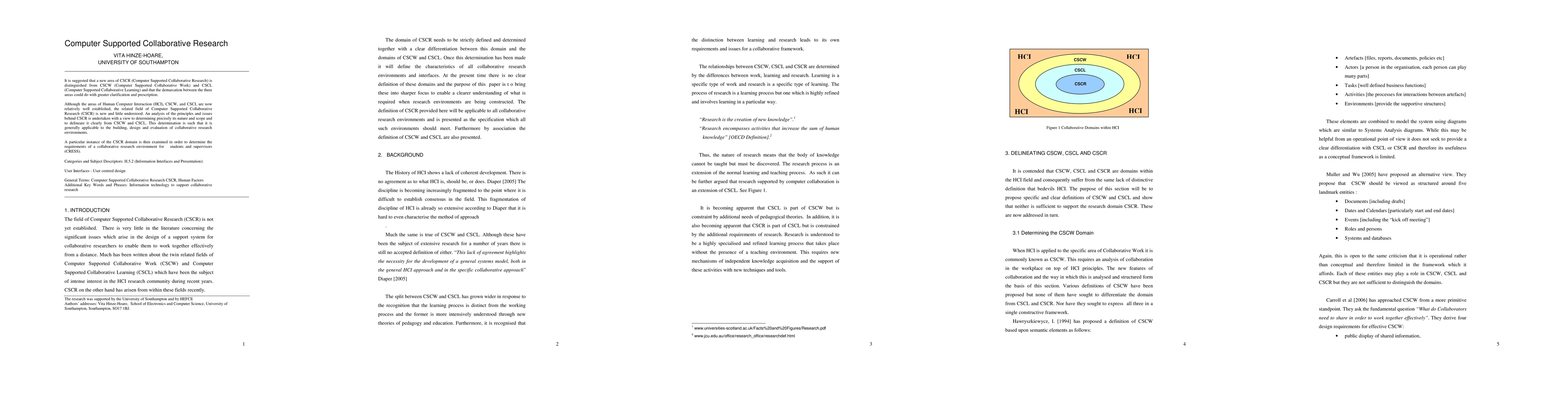 This paper distinguishes Computer Supported Collaborative Research (CSCR) from established fields like CSCW and CSCL, aiming to clarify its unique principles and scope. It analyzes the requirements for collaborative research environments, exemplified by the CRESS system for students and supervisors.