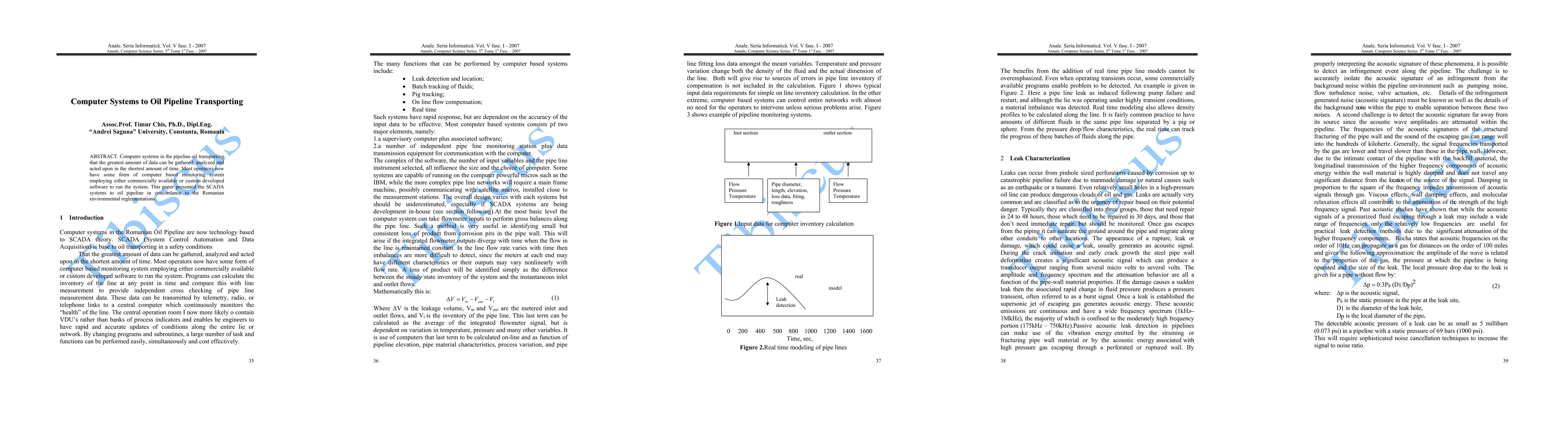 Summary: This paper examines the use of SCADA systems in Romanian oil pipelines, emphasizing efficient data gathering, analysis, and timely responses to environmental regulations. It discusses the integration of computer-based monitoring systems to optimize pipeline operations.