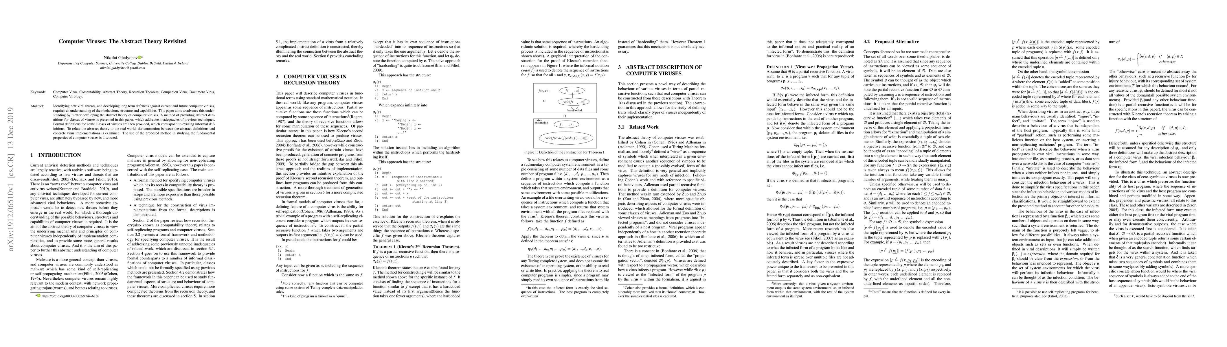 Identifying new viral threats, and developing long term defences against current and future computer viruses, requires an understanding of their behaviour, structure and capabilities. This paper aims to advance this understanding by further developing the abstract theory of computer viruses. A method of providing abstract definitions for classes of viruses is presented in this paper, which addresses inadequacies of previous techniques. Formal definitions for some classes of viruses are then provided, which correspond to existing informal definitions. To relate the abstract theory to the real world, the connection between the abstract definitions and concrete virus implementations is examined. The use of the proposed method in studying the fundamental properties of computer viruses is discussed.