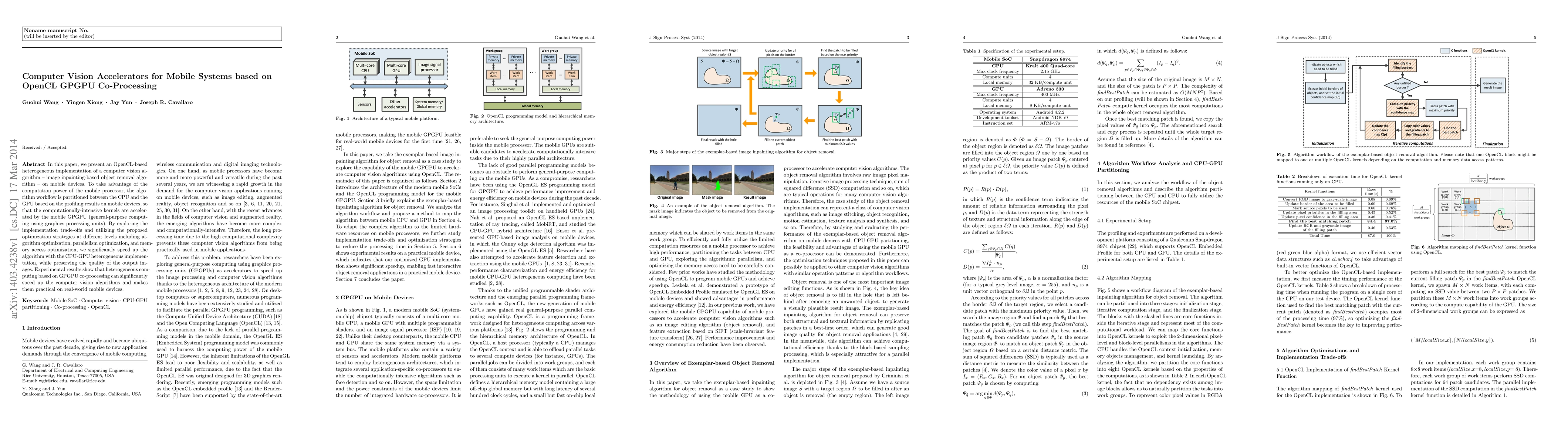 In this paper, we present an OpenCL-based heterogeneous implementation of a computer vision algorithm -- image inpainting-based object removal algorithm -- on mobile devices. To take advantage of the computation power of the mobile processor, the algorithm workflow is partitioned between the CPU and the GPU based on the profiling results on mobile devices, so that the computationally-intensive kernels are accelerated by the mobile GPGPU (general-purpose computing using graphics processing units). By exploring the implementation trade-offs and utilizing the proposed optimization strategies at different levels including algorithm optimization, parallelism optimization, and memory access optimization, we significantly speed up the algorithm with the CPU-GPU heterogeneous implementation, while preserving the quality of the output images. Experimental results show that heterogeneous computing based on GPGPU co-processing can significantly speed up the computer vision algorithms and makes them practical on real-world mobile devices.