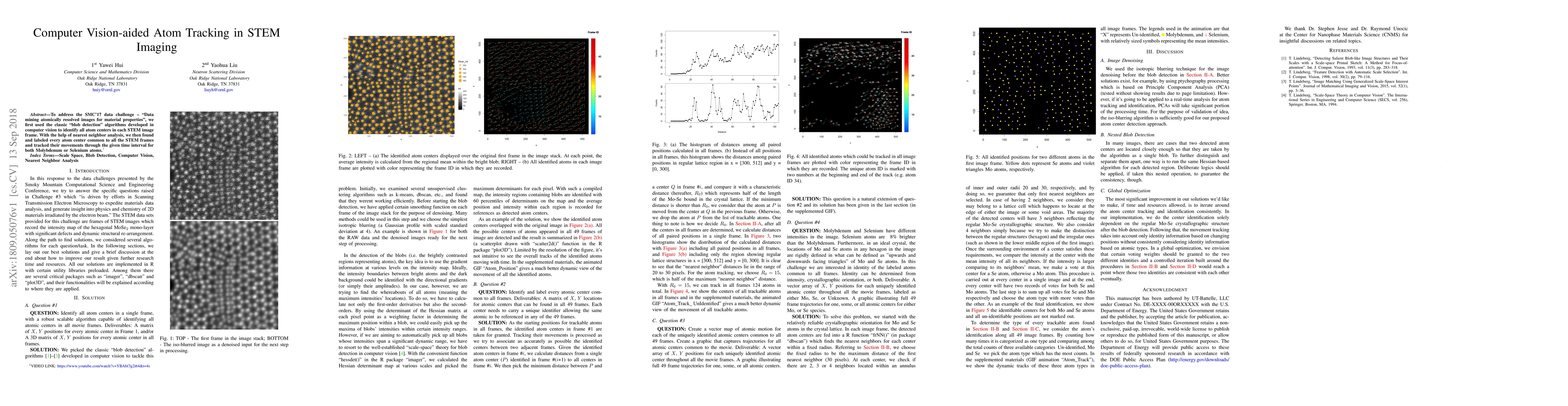 This research applies computer vision's blob detection to identify atom centers in Scanning Transmission Electron Microscopy (STEM) images, then uses nearest neighbor analysis to track atom movements across frames for Mo and Se atoms, addressing the SMC'17 data challenge.