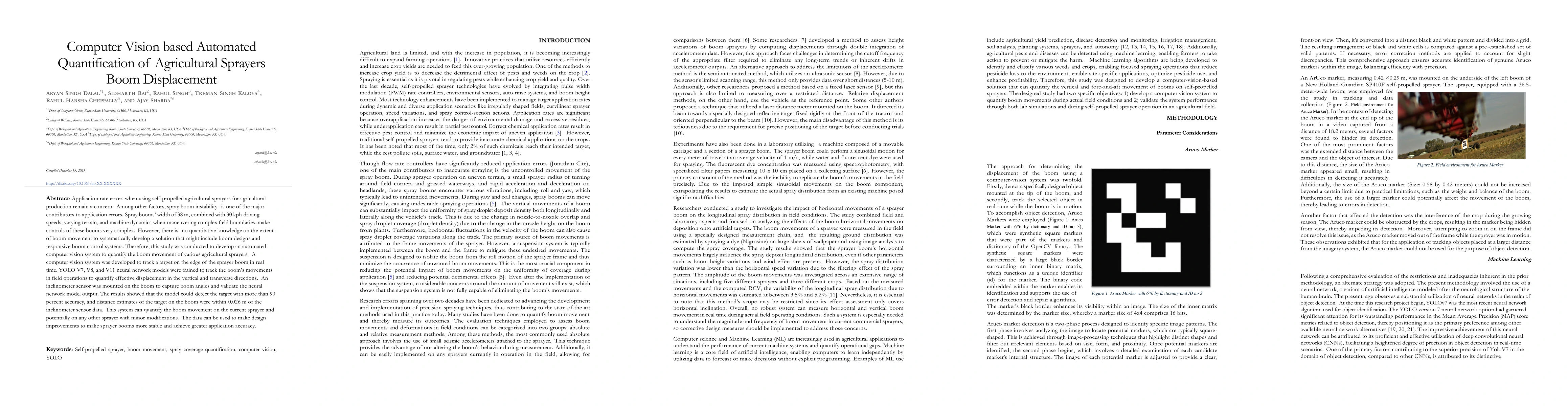 This study developed a computer vision system using YOLO V7, V8, and V11 models to quantify boom movements in agricultural sprayers. The system accurately detected boom displacement with high precision, offering potential for design improvements to increase sprayer boom stability and application accuracy.