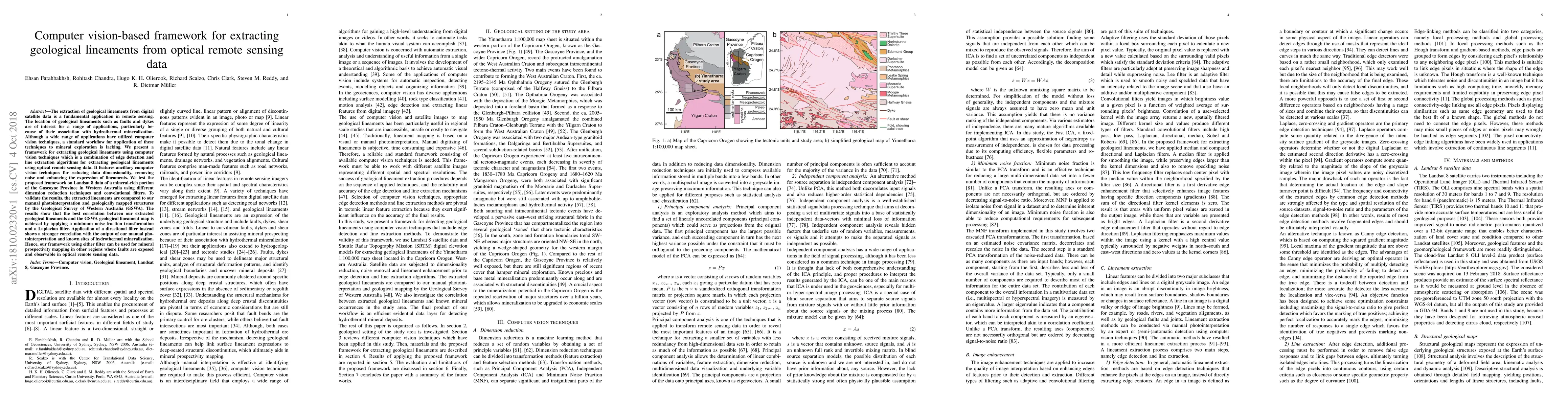 This paper presents a computer vision-based framework for extracting geological lineaments from optical remote sensing data, combining edge detection and line extraction techniques. The framework uses dimensionality reduction and noise removal techniques to enhance lineaments, tested on Landsat 8 data in Western Australia, showing strong correlation with geological maps and manual photointerpretation.