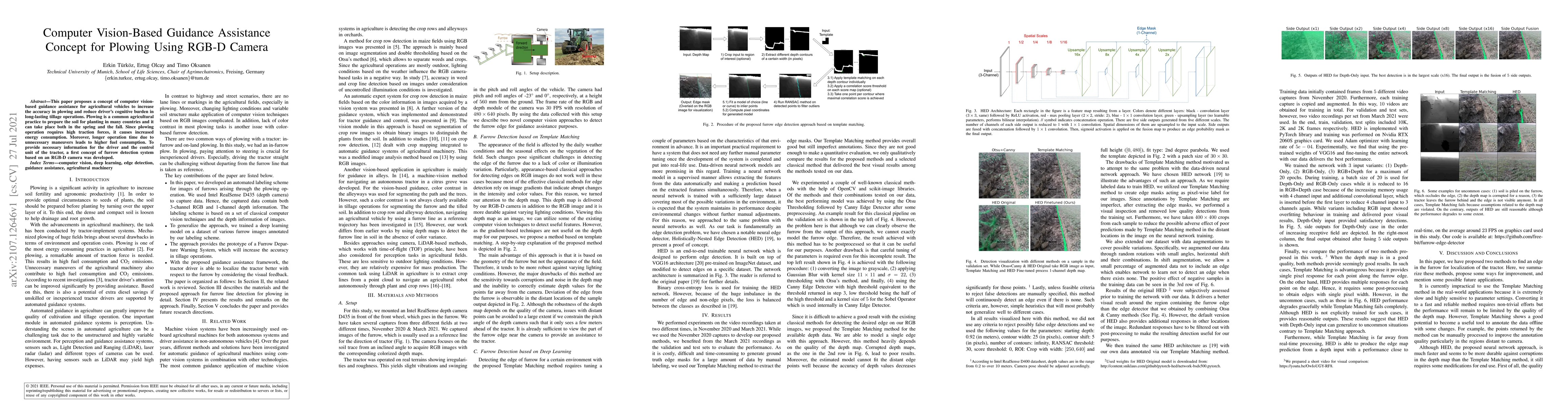 This paper proposes a concept of computer vision-based guidance assistance for agricultural vehicles to increase the accuracy in plowing and reduce driver's cognitive burden in long-lasting tillage operations. Plowing is a common agricultural practice to prepare the soil for planting in many countries and it can take place both in the spring and the fall. Since plowing operation requires high traction forces, it causes increased energy consumption. Moreover, longer operation time due to unnecessary maneuvers leads to higher fuel consumption. To provide necessary information for the driver and the control unit of the tractor, a first concept of furrow detection system based on an RGB-D camera was developed.