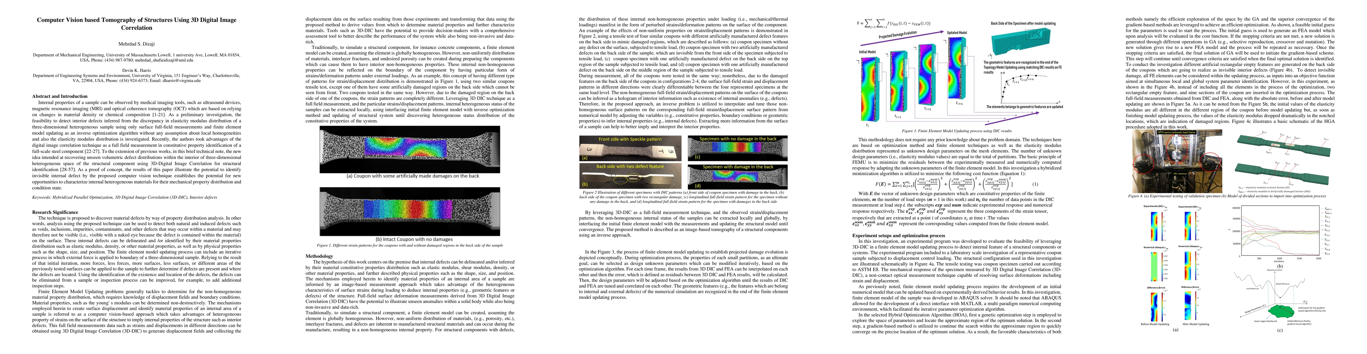 Internal properties of a sample can be observed by medical imaging tools, such as ultrasound devices, magnetic resonance imaging (MRI) and optical coherence tomography (OCT) which are based on relying on changes in material density or chemical composition [1-21]. As a preliminary investigation, the feasibility to detect interior defects inferred from the discrepancy in elasticity modulus distribution of a three-dimensional heterogeneous sample using only surface full-field measurements and finite element model updating as an inverse optimization algorithm without any assumption about local homogeneities and also the elasticity modulus distribution is investigated. Recently, the authors took advantages of the digital image correlation technique as a full field measurement in constitutive property identification of a full-scale steel component [22-27]. To the extension of previous works, in this brief technical note, the new idea intended at recovering unseen volumetric defect distributions within the interior of three-dimensional heterogeneous space of the structural component using 3D-Digital Image Correlation for structural identification [28-57]. As a proof of concept, the results of this paper illustrate the potential to identify invisible internal defect by the proposed computer vision technique establishes the potential for new opportunities to characterize internal heterogeneous materials for their mechanical property distribution and condition state.