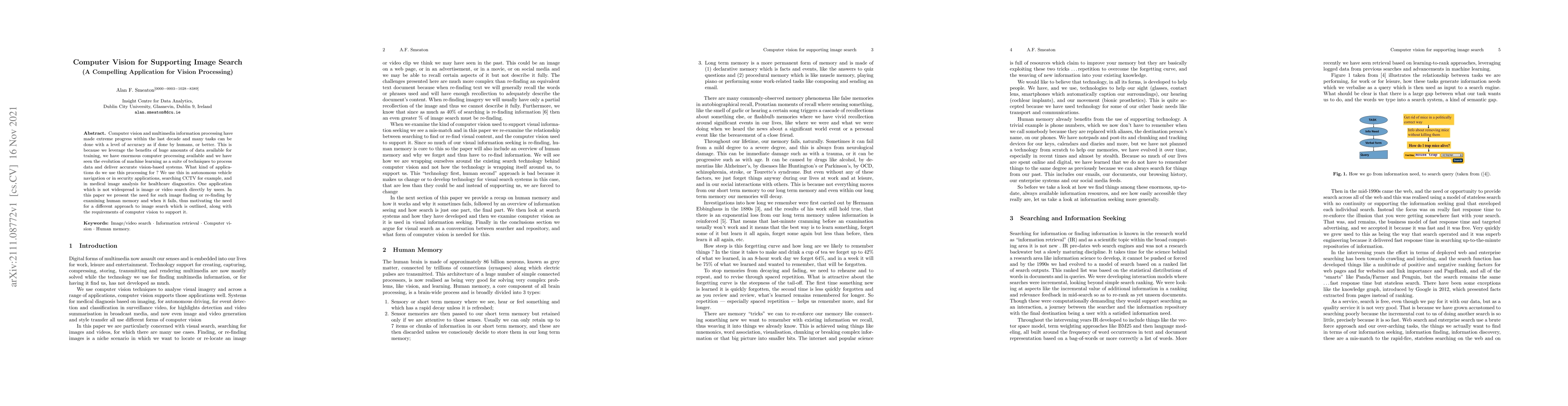 Computer vision and multimedia information processing have made extreme progress within the last decade and many tasks can be done with a level of accuracy as if done by humans, or better. This is because we leverage the benefits of huge amounts of data available for training, we have enormous computer processing available and we have seen the evolution of machine learning as a suite of techniques to process data and deliver accurate vision-based systems. What kind of applications do we use this processing for ? We use this in autonomous vehicle navigation or in security applications, searching CCTV for example, and in medical image analysis for healthcare diagnostics. One application which is not widespread is image or video search directly by users. In this paper we present the need for such image finding or re-finding by examining human memory and when it fails, thus motivating the need for a different approach to image search which is outlined, along with the requirements of computer vision to support it.