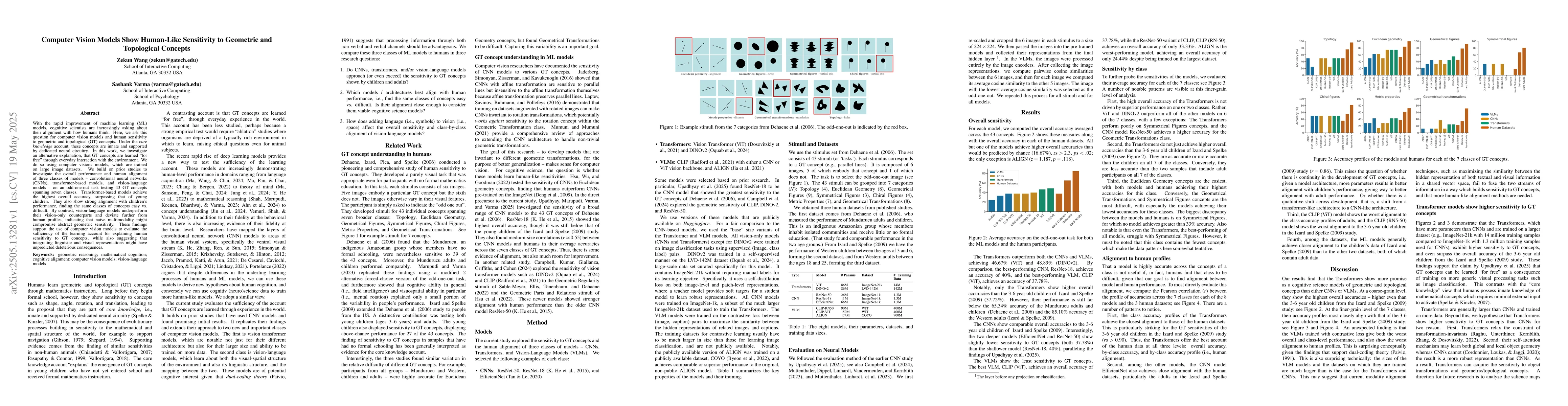 Demonstrated that transformer-based models exhibit human-like sensitivity to geometric and topological concepts, surpassing both CNNs and vision-language models in accuracy and alignment with children's performance.