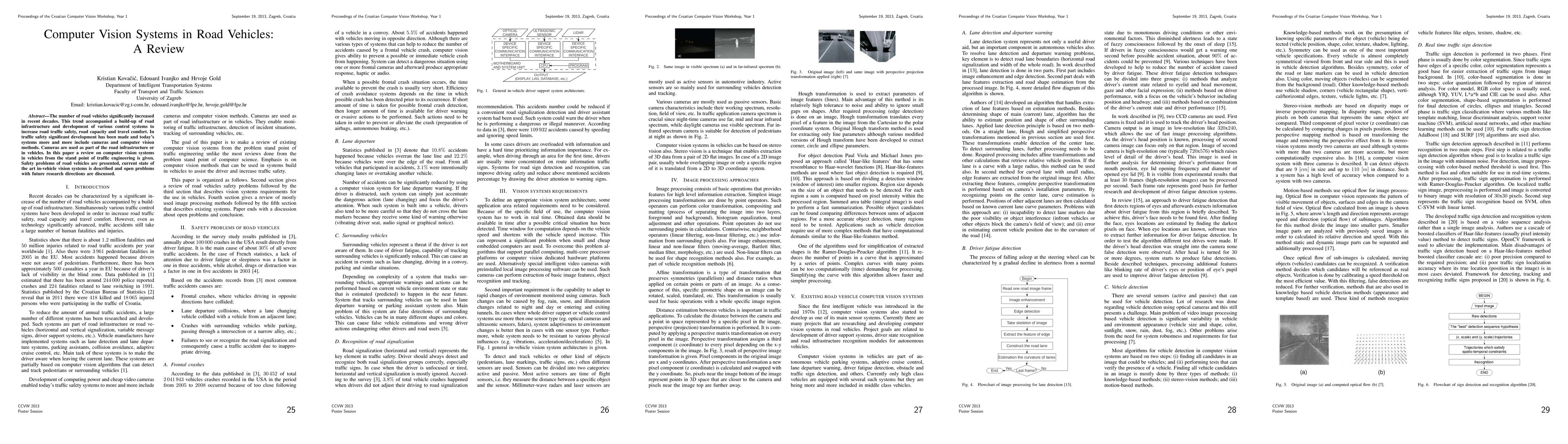 The number of road vehicles significantly increased in recent decades. This trend accompanied a build-up of road infrastructure and development of various control systems to increase road traffic safety, road capacity and travel comfort. In traffic safety significant development has been made and today's systems more and more include cameras and computer vision methods. Cameras are used as part of the road infrastructure or in vehicles. In this paper a review on computer vision systems in vehicles from the stand point of traffic engineering is given. Safety problems of road vehicles are presented, current state of the art in-vehicle vision systems is described and open problems with future research directions are discussed.