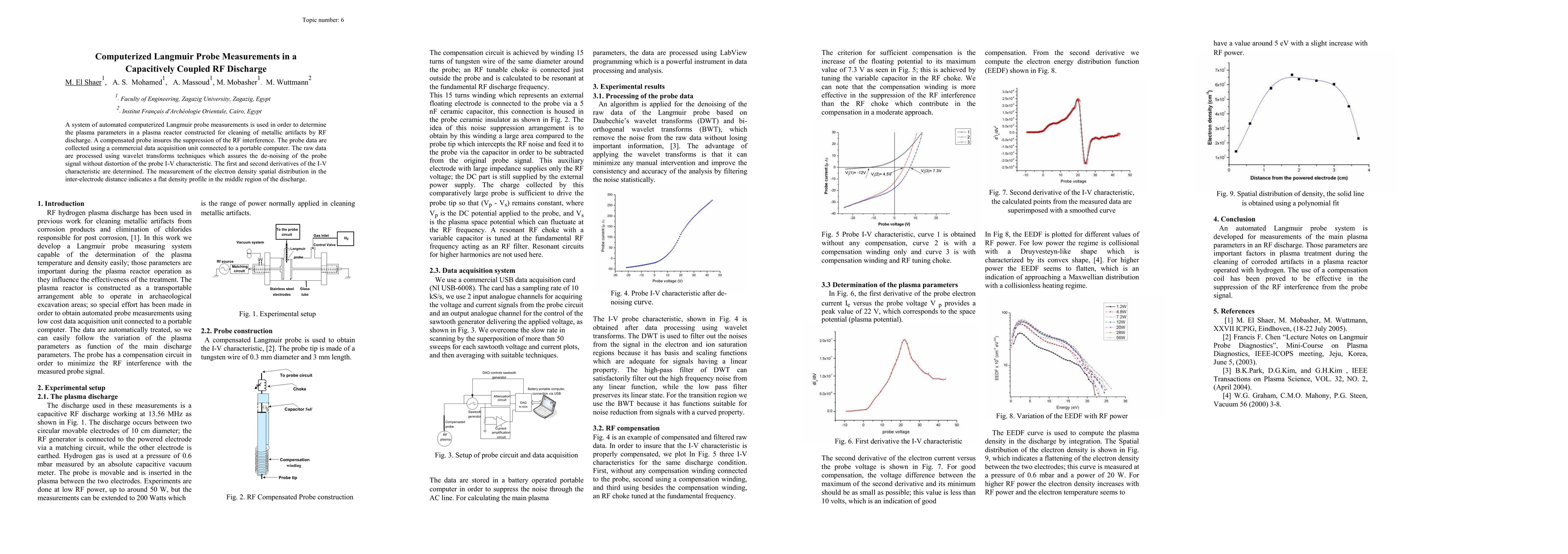 This paper describes an automated computerized Langmuir probe system for measuring plasma parameters in an RF discharge reactor used for cleaning metallic artifacts. The system employs wavelet transforms to de-noise the probe signal while preserving the I-V characteristic, revealing a flat electron density profile in the middle region of the discharge.