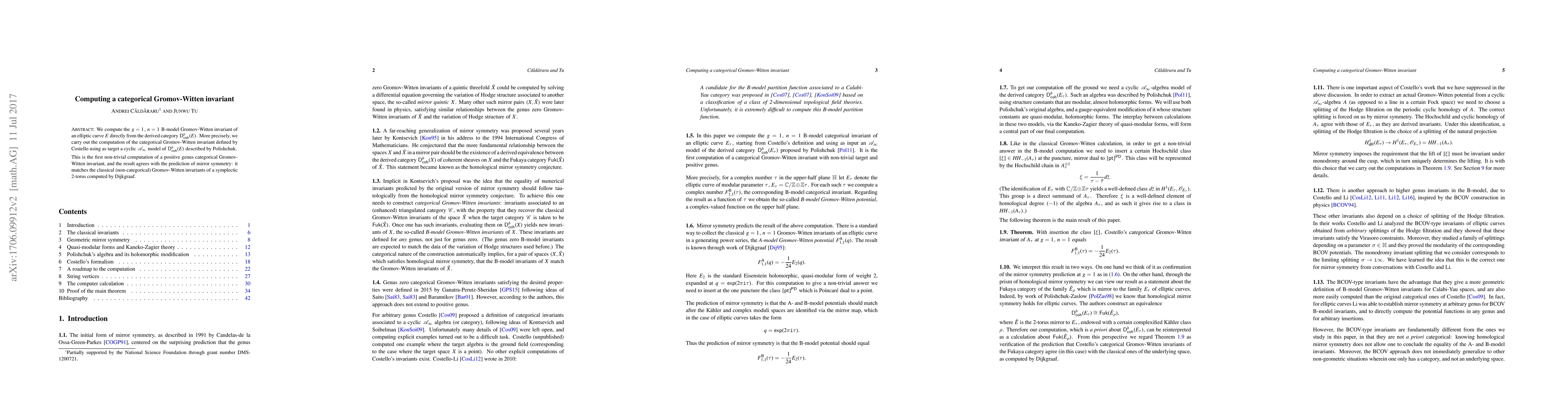 This paper computes the $g=1, n=1$ B-model Gromov-Witten invariant for an elliptic curve using categorical methods and derived categories, confirming predictions from mirror symmetry against classical results. This marks the first non-trivial computation of a positive genus categorical Gromov-Witten invariant.