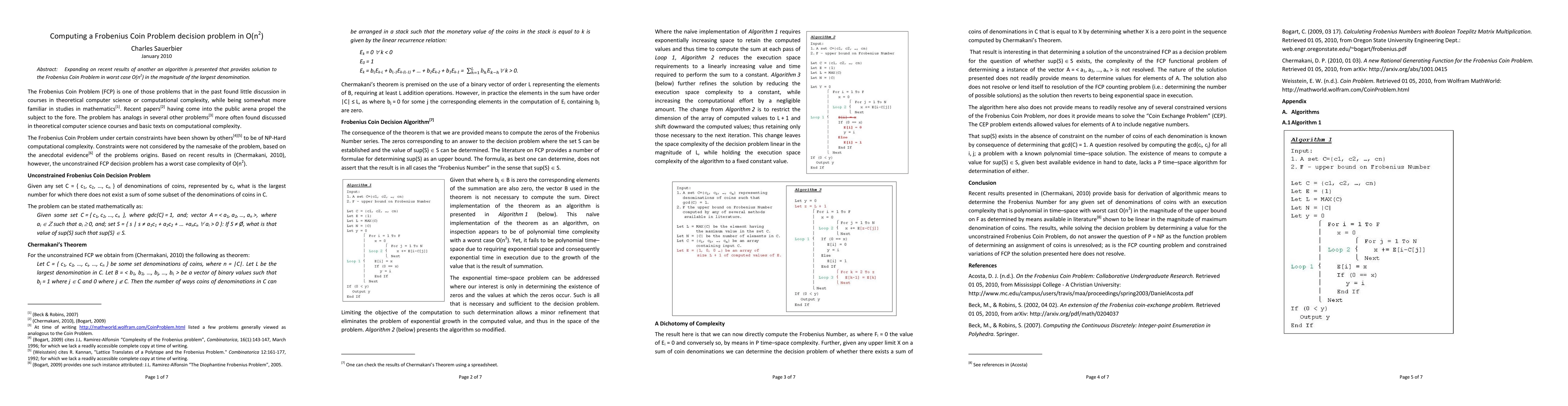 Expanding on recent results of another an algorithm is presented that provides solution to the Frobenius Coin Problem in worst case O(n^2) in the magnitude of the largest denomination.