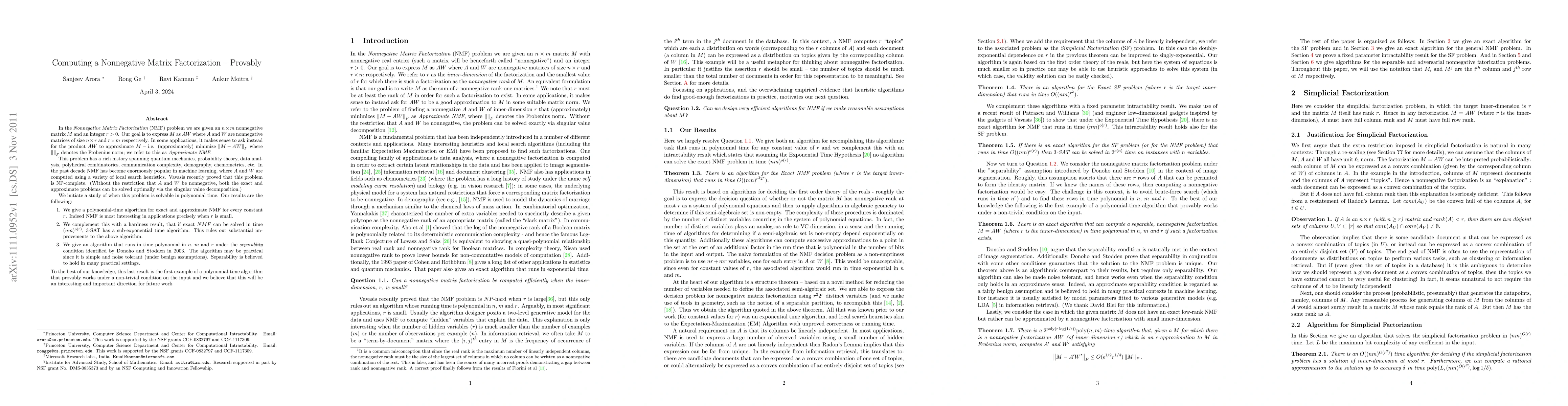 This paper presents polynomial-time algorithms for solving Nonnegative Matrix Factorization (NMF) under specific conditions, including exact and approximate factorization for constant rank. It also establishes a hardness result, showing that substantial improvements to the algorithm are unlikely, and introduces a practical algorithm under the separability condition, marking a significant step in provably effective NMF solutions.
