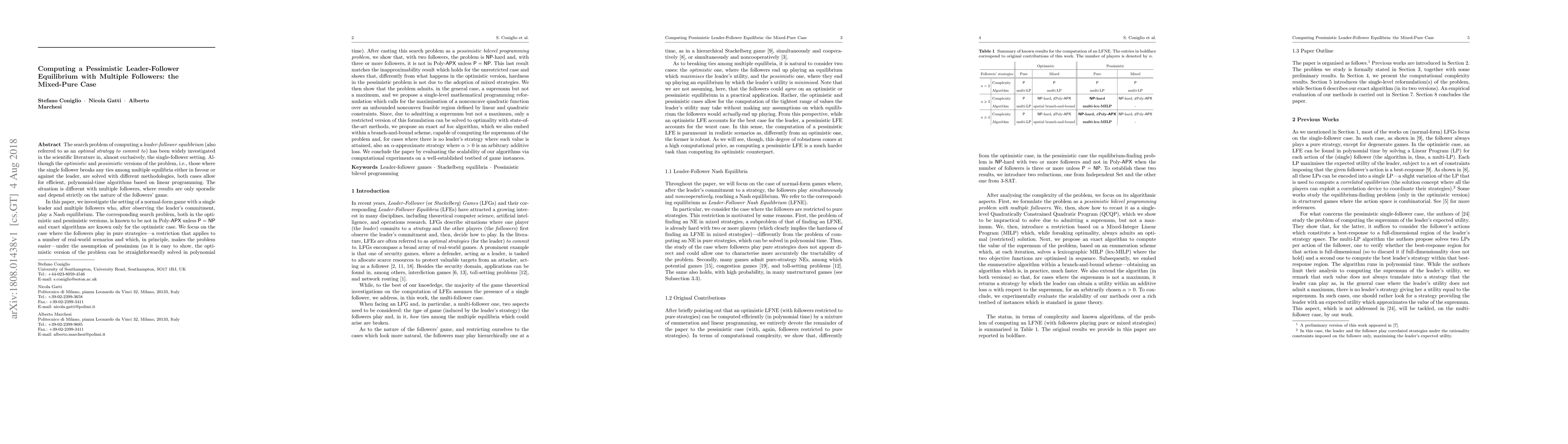 The search problem of computing a \textit{leader-follower equilibrium} has been widely investigated in the scientific literature in, almost exclusively, the single-follower setting. Although the \textit{optimistic} and \ textit{pessimistic} versions of the problem are solved with different methodologies, both cases allow for efficient, polynomial-time algorithms based on linear programming. The situation is different with multiple followers, where results are only sporadic and depend strictly on the nature of the followers' game. In this paper, we investigate the setting of a normal-form game with a single leader and multiple followers who, after observing the leader's commitment, play a Nash equilibrium. The corresponding search problem, both in the optimistic and pessimistic versions, is known to be not in Poly-$\textsf{APX}$ unless $\textsf{P}=\textsf{NP}$ and exact algorithms are known only for the optimistic case. We focus on the case where the followers play in pure strategies under the assumption of pessimism. After casting this search problem as a \italic{pessimistic bilevel programming problem}, we show that, with two followers, the problem is $\textsf{NP}$-hard and, with three or more followers, it is not in Poly-$\textsf{APX}$ unless $\textsf{P}=\textsf{NP}$. We propose a single-level mathematical programming reformulation which calls for the maximisation of a nonconcave quadratic function over an unbounded nonconvex feasible region defined by linear and quadratic constraints. Since, due to admitting a supremum but not a maximum, only a restricted version of this formulation can be solved to optimality with state-of-the-art methods, we propose an exact \textit{ad hoc} algorithm, which we also embed within a branch-and-bound scheme, capable of computing the supremum of the problem.