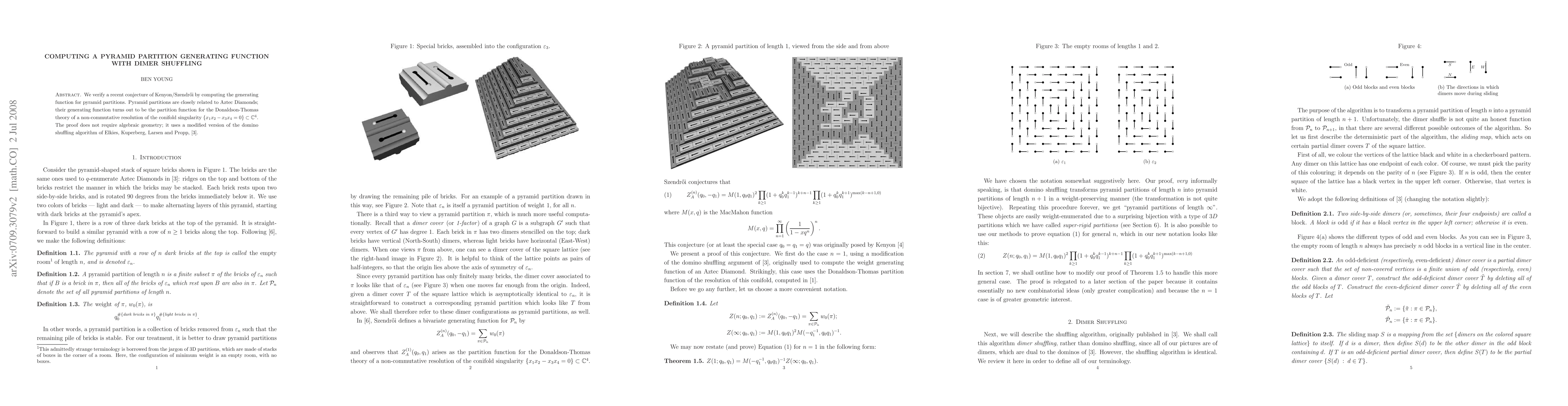 This paper verifies a conjecture by Kenyon and Szendroi regarding the generating function for pyramid partitions, employing a modified domino shuffling algorithm instead of algebraic geometry. The result connects pyramid partitions to the Donaldson-Thomas theory of a non-commutative resolution of the conifold singularity.