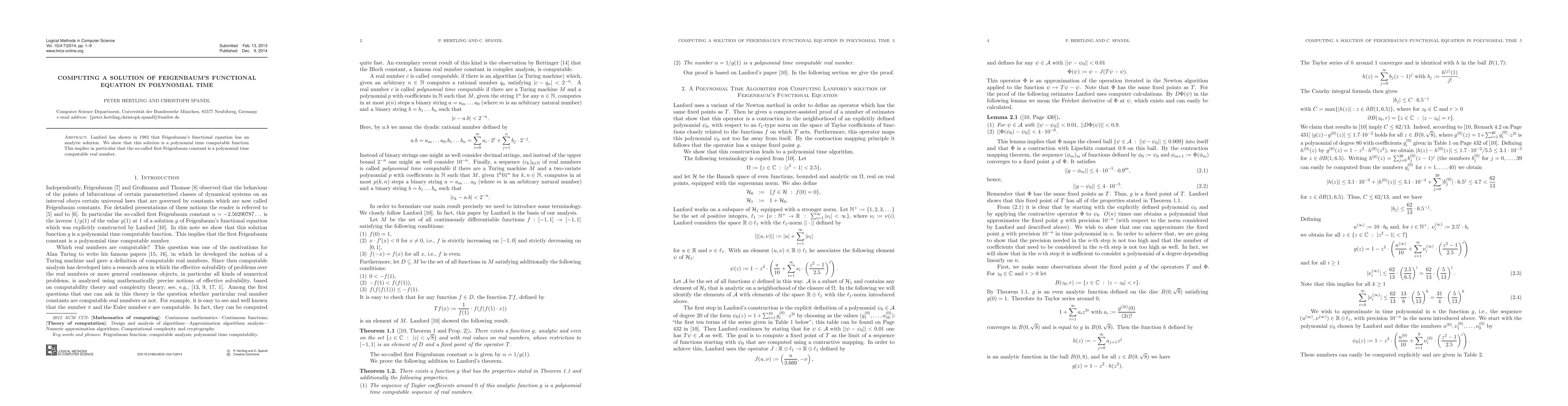 Lanford has shown that Feigenbaum's functional equation has an analytic solution. We show that this solution is a polynomial time computable function. This implies in particular that the so-called first Feigenbaum constant is a polynomial time computable real number.