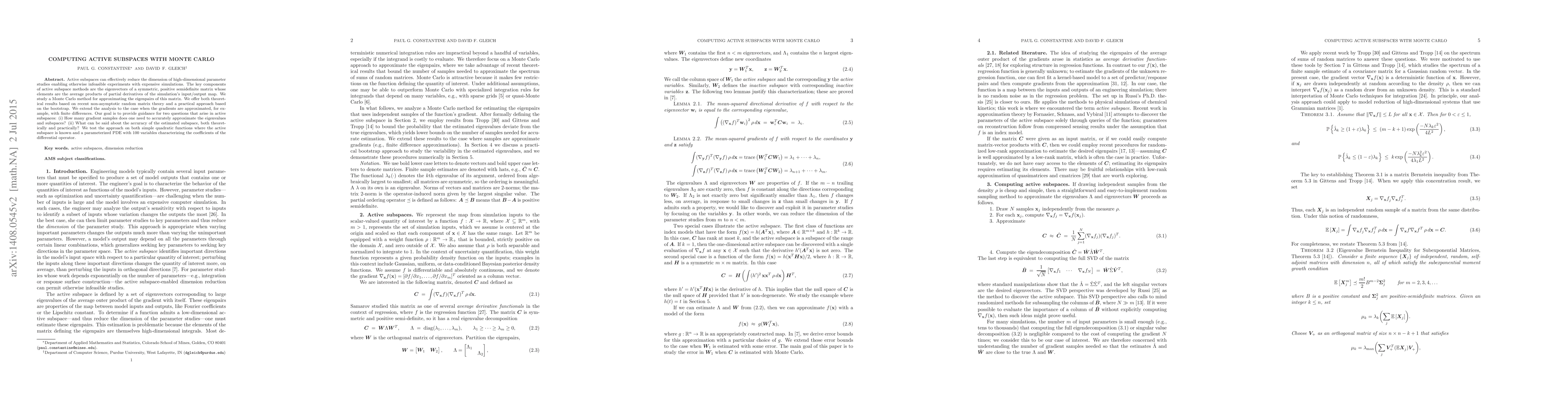 This paper proposes a Monte Carlo method for approximating active subspaces in high-dimensional simulations, focusing on the eigenvalues and eigenvectors of a matrix. It provides theoretical and practical insights into the number of gradient samples needed and the accuracy of the estimated subspaces, tested on both simple functions and complex PDEs.