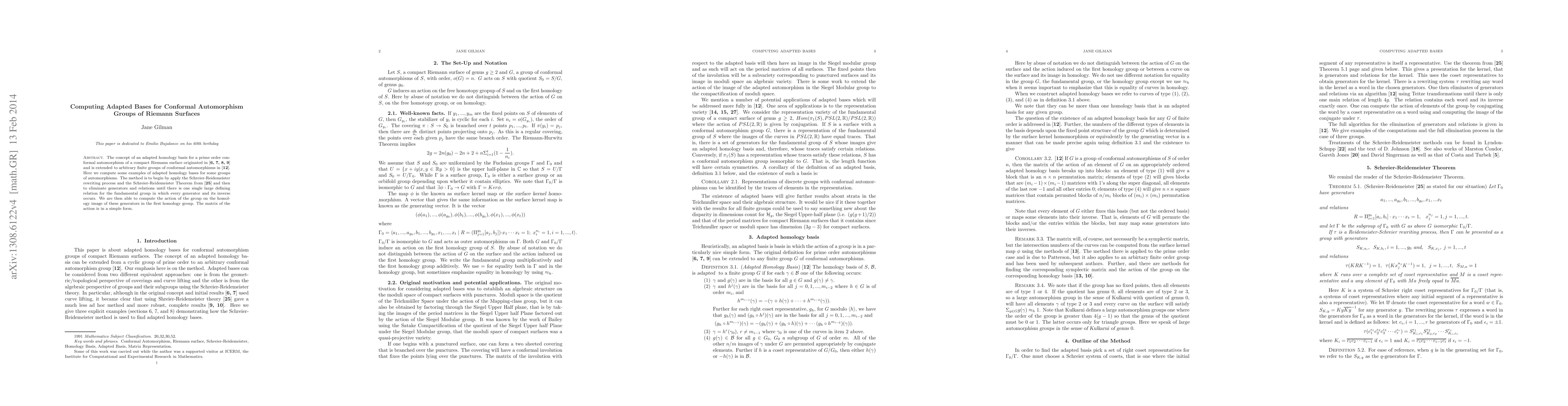 The concept of an adapted homology basis for a prime order conformal automorphism of a compact Riemann surface extends to arbitrary finite groups of conformal automorphisms. Here we compute some examples of adapted homology bases for some groups of automorphisms. The method is to begin by apply the Schreier-Reidemeister rewriting process along with the Schreier-Reidemeister Theorem and then to eliminate generators and relations until there is one single large defining relation for the fundamental group in which every generator and its inverse occurs. We are then able to compute the action of the group on the homology image of these generators in the first homology group. The matrix of the action is in a simple form. This has applications to the representation variety.