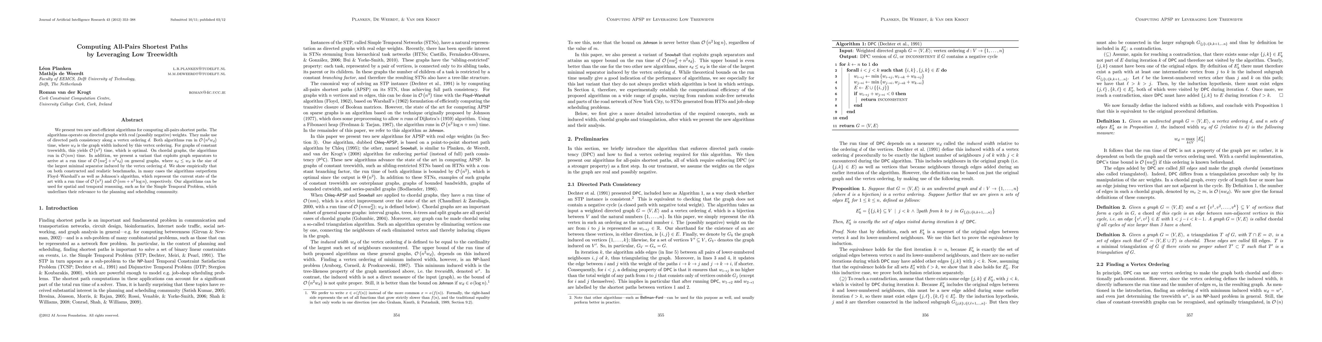 We present two new and efficient algorithms for computing all-pairs shortest paths. The algorithms operate on directed graphs with real (possibly negative) weights. They make use of directed path consistency along a vertex ordering d. Both algorithms run in O(n^2 w_d) time, where w_d is the graph width induced by this vertex ordering. For graphs of constant treewidth, this yields O(n^2) time, which is optimal. On chordal graphs, the algorithms run in O(nm) time. In addition, we present a variant that exploits graph separators to arrive at a run time of O(n w_d^2 + n^2 s_d) on general graphs, where s_d andlt= w_d is the size of the largest minimal separator induced by the vertex ordering d. We show empirically that on both constructed and realistic benchmarks, in many cases the algorithms outperform Floyd-Warshalls as well as Johnsons algorithm, which represent the current state of the art with a run time of O(n^3) and O(nm + n^2 log n), respectively. Our algorithms can be used for spatial and temporal reasoning, such as for the Simple Temporal Problem, which underlines their relevance to the planning and scheduling community.
