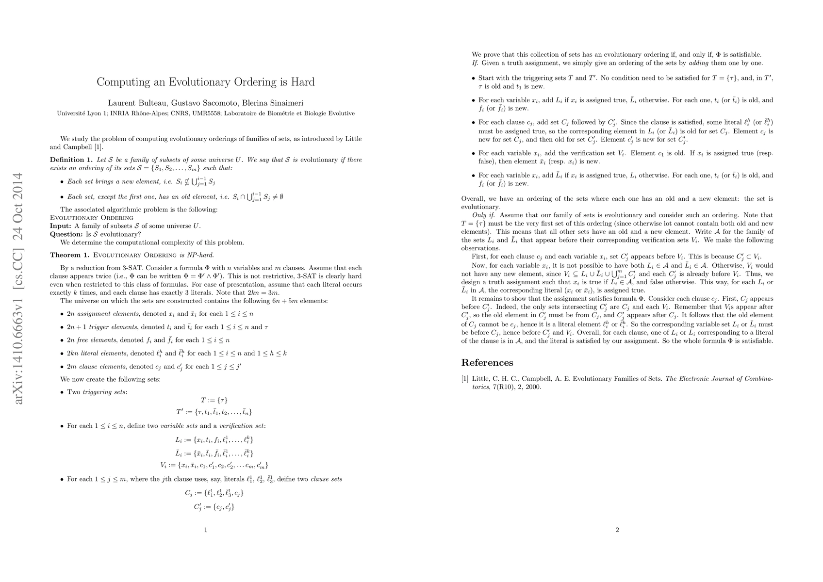 We prove that computing an evolutionary ordering of a family of sets, i.e. an ordering where each set intersects with --but is not included in-- the union earlier sets, is NP-hard.