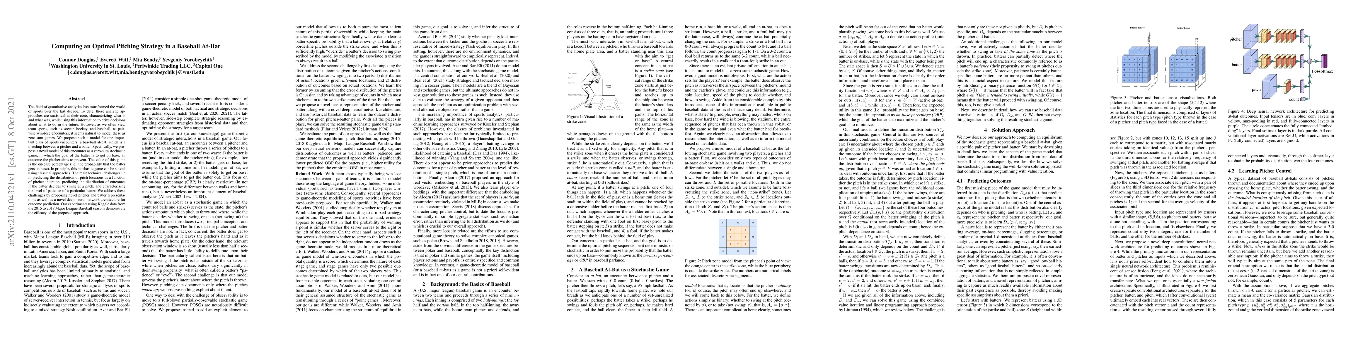 The field of quantitative analytics has transformed the world of sports over the last decade. To date, these analytic approaches are statistical at their core, characterizing what is and what was, while using this information to drive decisions about what to do in the future. However, as we often view team sports, such as soccer, hockey, and baseball, as pairwise win-lose encounters, it seems natural to model these as zero-sum games. We propose such a model for one important class of sports encounters: a baseball at-bat, which is a matchup between a pitcher and a batter. Specifically, we propose a novel model of this encounter as a zero-sum stochastic game, in which the goal of the batter is to get on base, an outcome the pitcher aims to prevent. The value of this game is the on-base percentage (i.e., the probability that the batter gets on base). In principle, this stochastic game can be solved using classical approaches. The main technical challenges lie in predicting the distribution of pitch locations as a function of pitcher intention, predicting the distribution of outcomes if the batter decides to swing at a pitch, and characterizing the level of patience of a particular batter. We address these challenges by proposing novel pitcher and batter representations as well as a novel deep neural network architecture for outcome prediction. Our experiments using Kaggle data from the 2015 to 2018 Major League Baseball seasons demonstrate the efficacy of the proposed approach.