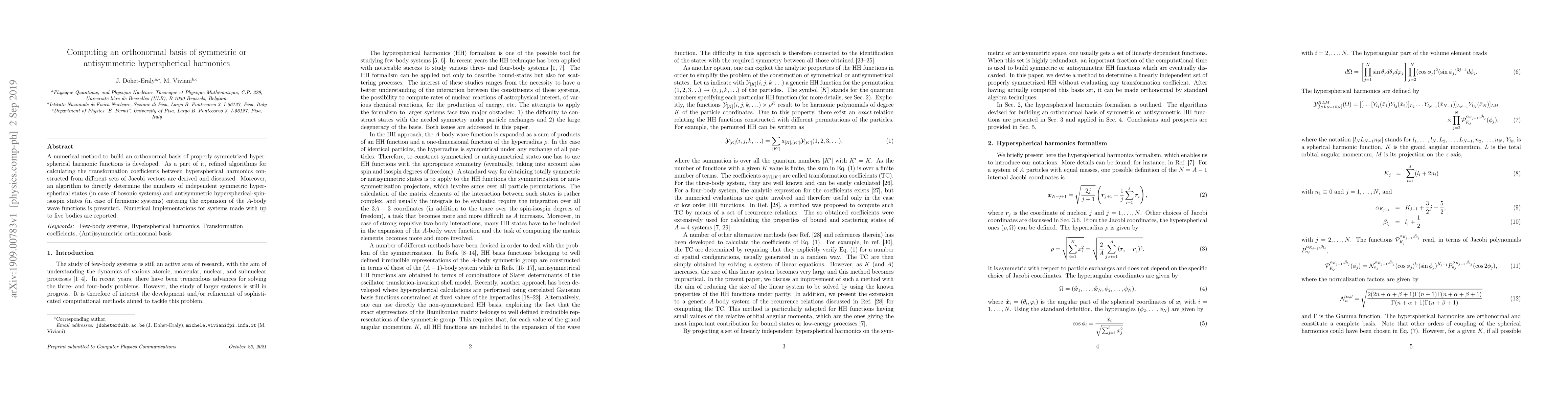 A numerical method to build an orthonormal basis of properly symmetrized hyperspherical harmonic functions is developed. As a part of it, refined algorithms for calculating the transformation coefficients between hyperspherical harmonics constructed from different sets of Jacobi vectors are derived and discussed. Moreover, an algorithm to directly determine the numbers of independent symmetric hyperspherical states (in case of bosonic systems) and antisymmetric hyperspherical-spinisospin states (in case of fermionic systems) entering the expansion of the A-body wave functions is presented. Numerical implementations for systems made with up to five bodies are reported.