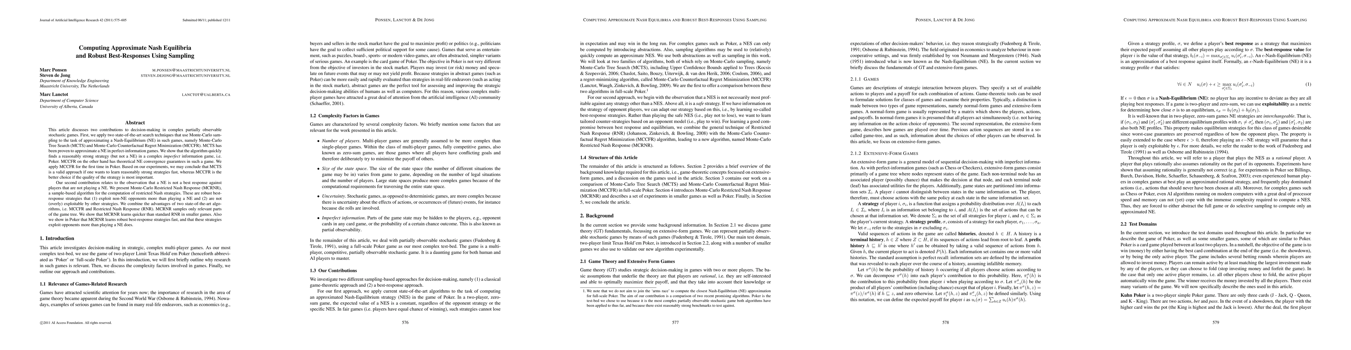 This article discusses two contributions to decision-making in complex partially observable stochastic games. First, we apply two state-of-the-art search techniques that use Monte-Carlo sampling to the task of approximating a Nash-Equilibrium (NE) in such games, namely Monte-Carlo Tree Search (MCTS) and Monte-Carlo Counterfactual Regret Minimization (MCCFR). MCTS has been proven to approximate a NE in perfect-information games. We show that the algorithm quickly finds a reasonably strong strategy (but not a NE) in a complex imperfect information game, i.e. Poker. MCCFR on the other hand has theoretical NE convergence guarantees in such a game. We apply MCCFR for the first time in Poker. Based on our experiments, we may conclude that MCTS is a valid approach if one wants to learn reasonably strong strategies fast, whereas MCCFR is the better choice if the quality of the strategy is most important. Our second contribution relates to the observation that a NE is not a best response against players that are not playing a NE. We present Monte-Carlo Restricted Nash Response (MCRNR), a sample-based algorithm for the computation of restricted Nash strategies. These are robust best-response strategies that (1) exploit non-NE opponents more than playing a NE and (2) are not (overly) exploitable by other strategies. We combine the advantages of two state-of-the-art algorithms, i.e. MCCFR and Restricted Nash Response (RNR). MCRNR samples only relevant parts of the game tree. We show that MCRNR learns quicker than standard RNR in smaller games. Also we show in Poker that MCRNR learns robust best-response strategies fast, and that these strategies exploit opponents more than playing a NE does.