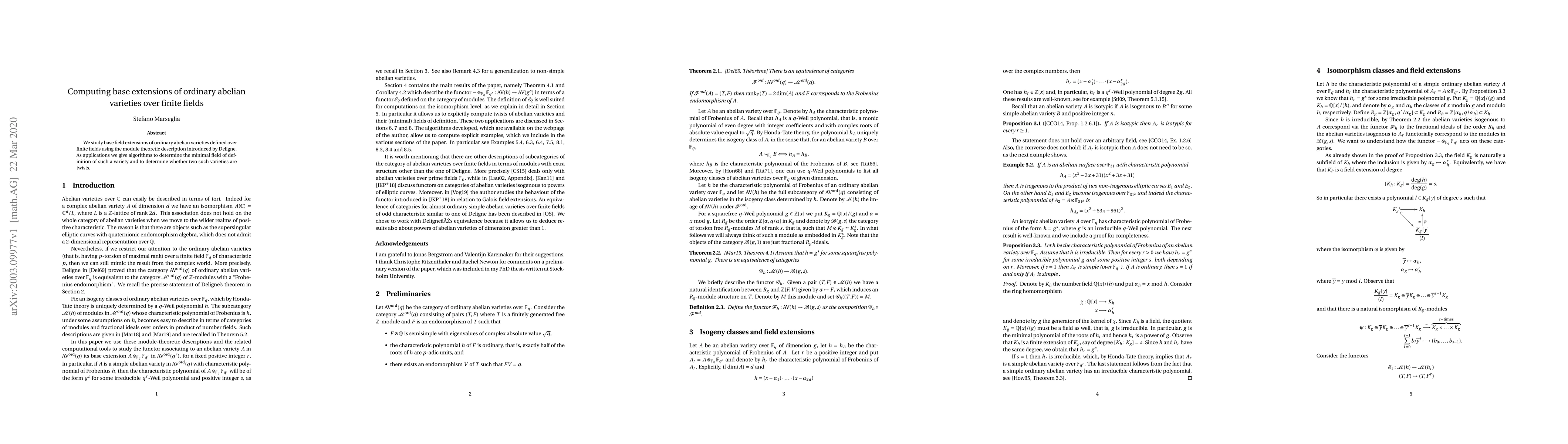 Summary: This paper explores the base field extensions of ordinary abelian varieties over finite fields using Deligne's module-theoretic description. It provides algorithms for determining the minimal field of definition and for checking if two such varieties are twists.