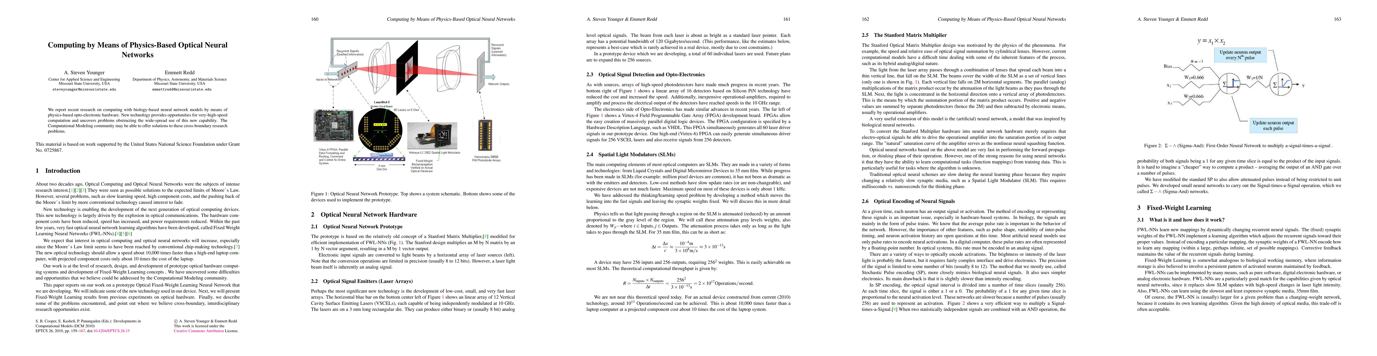 We report recent research on computing with biology-based neural network models by means of physics-based opto-electronic hardware. New technology provides opportunities for very-high-speed computation and uncovers problems obstructing the wide-spread use of this new capability. The Computation Modeling community may be able to offer solutions to these cross-boundary research problems.