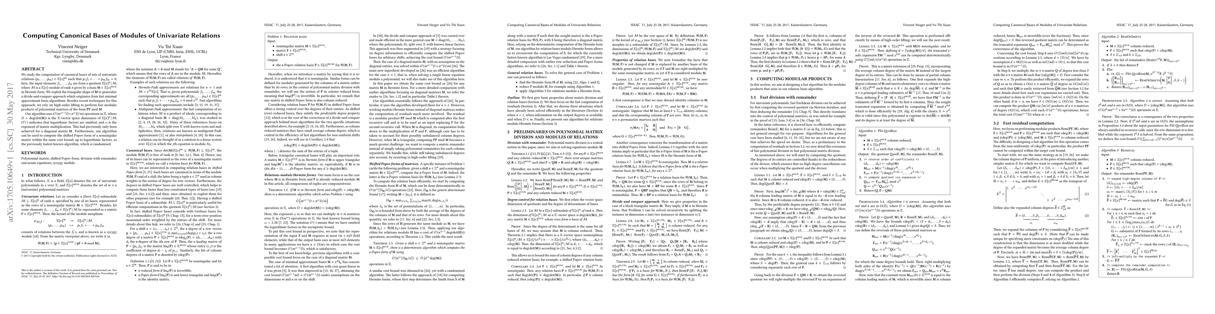 We study the computation of canonical bases of sets of univariate relations $(p_1,\ldots,p_m) \in \mathbb{K}[x]^{m}$ such that $p_1 f_1 + \cdots + p_m f_m = 0$; here, the input elements $f_1,\ldots,f_m$ are from a quotient $\mathbb{K}[x]^n/\mathcal{M}$, where $\mathcal{M}$ is a $\mathbb{K}[x]$-module of rank $n$ given by a basis $\mathbf{M}\in\mathbb{K}[x]^{n\times n}$ in Hermite form. We exploit the triangular shape of $\mathbf{M}$ to generalize a divide-and-conquer approach which originates from fast minimal approximant basis algorithms. Besides recent techniques for this approach, we rely on high-order lifting to perform fast modular products of polynomial matrices of the form $\mathbf{P}\mathbf{F} \bmod \mathbf{M}$. Our algorithm uses $O\tilde{~}(m^{\omega-1}D + n^{\omega} D/m)$ operations in $\mathbb{K}$, where $D = \mathrm{deg}(\det(\mathbf{M}))$ is the $\mathbb{K}$-vector space dimension of $\mathbb{K}[x]^n/\mathcal{M}$, $O\tilde{~}(\cdot)$ indicates that logarithmic factors are omitted, and $\omega$ is the exponent of matrix multiplication. This had previously only been achieved for a diagonal matrix $\mathbf{M}$. Furthermore, our algorithm can be used to compute the shifted Popov form of a nonsingular matrix within the same cost bound, up to logarithmic factors, as the previously fastest known algorithm, which is randomized.
