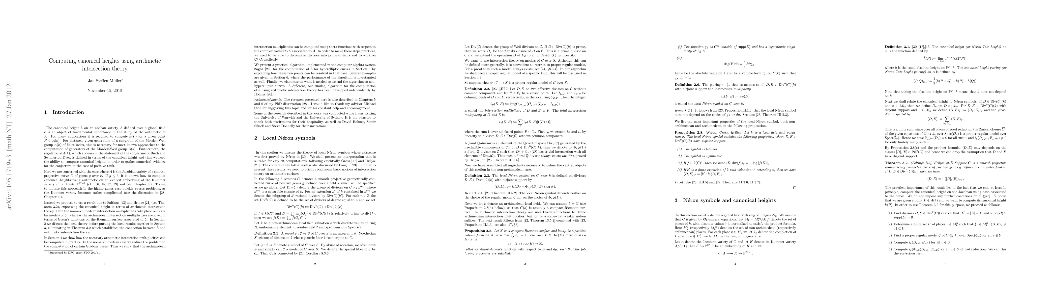 This paper presents a method for computing canonical heights on the Jacobian of smooth projective curves using arithmetic intersection theory on regular models, with a complete algorithm for hyperelliptic curves implemented in Magma, and discusses its computational performance.