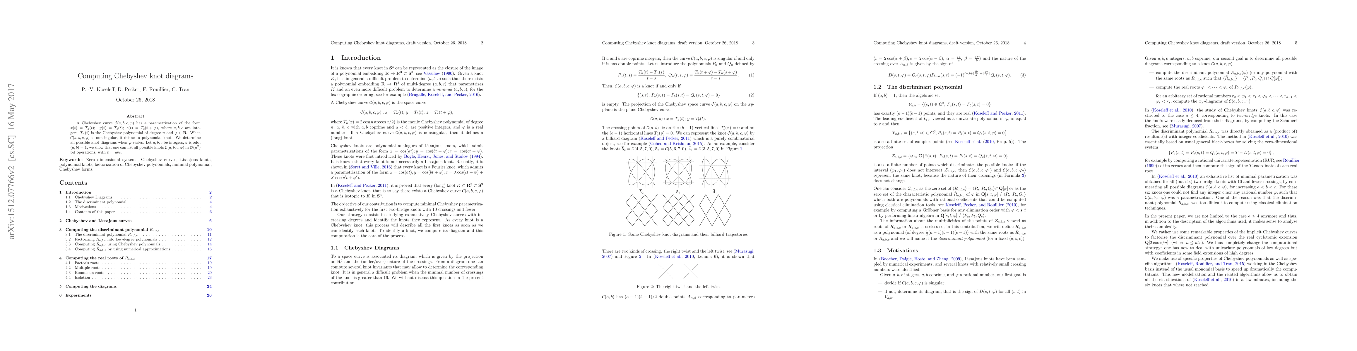 A Chebyshev curve $\mathcal{C}(a,b,c,\phi)$ has a parametrization of the form$ x(t)=T\_a(t)$; \ $y(t)=T\_b(t)$; $z(t)= T\_c(t + \phi)$, where $a,b,c$are integers, $T\_n(t)$ is the Chebyshev polynomialof degree $n$ and $\phi \in \mathbb{R}$. When $\mathcal{C}(a,b,c,\phi)$ is nonsingular,it defines a polynomial knot. We determine all possible knot diagrams when $\phi$ varies. Let $a,b,c$ be integers, $a$ is odd, $(a,b)=1$, we show that one can list all possible knots $\mathcal{C}(a,b,c,\phi)$ in$\tilde{\mathcal{O}}(n^2)$ bit operations, with $n=abc$.