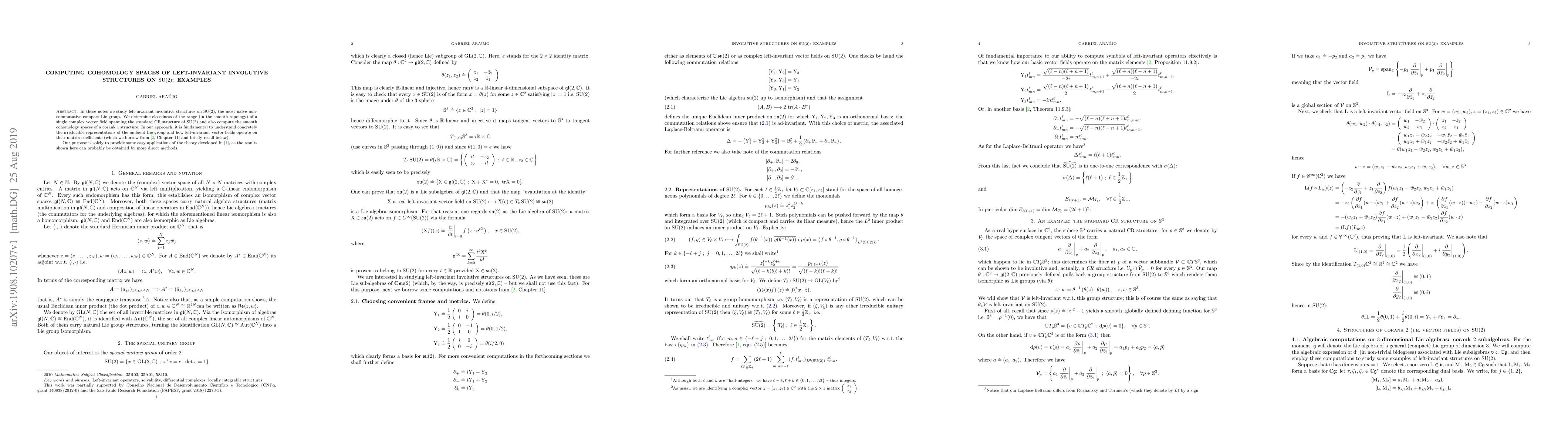 Summary: This paper investigates left-invariant involutive structures on $\mathrm{SU}(2)$, determining the closedness of a complex vector field and computing the smooth cohomology spaces of a corank $1$ structure, leveraging the irreducible representations of $\mathrm{SU}(2)$ and previous theoretical work. The results serve to illustrate applications of a prior theory.
