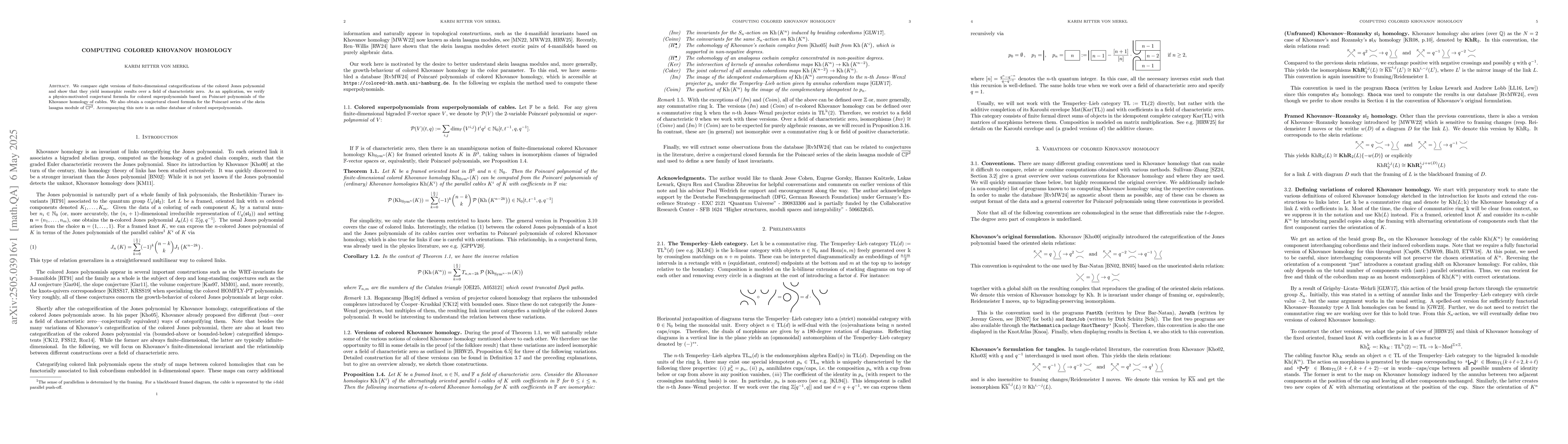 We compare eight versions of finite-dimensional categorifications of the colored Jones polynomial and show that they yield isomorphic results over a field of characteristic zero. As an application, we verify a physics-motivated conjectural formula for colored superpolynomials based on Poincar\'e polynomials of the Khovanov homology of cables. We also obtain a conjectural closed formula for the Poincar\'e series of the skein lasagna module of $\overline{\mathbb{CP}^2}$. Accompanying this note is an online database of colored superpolynomials.