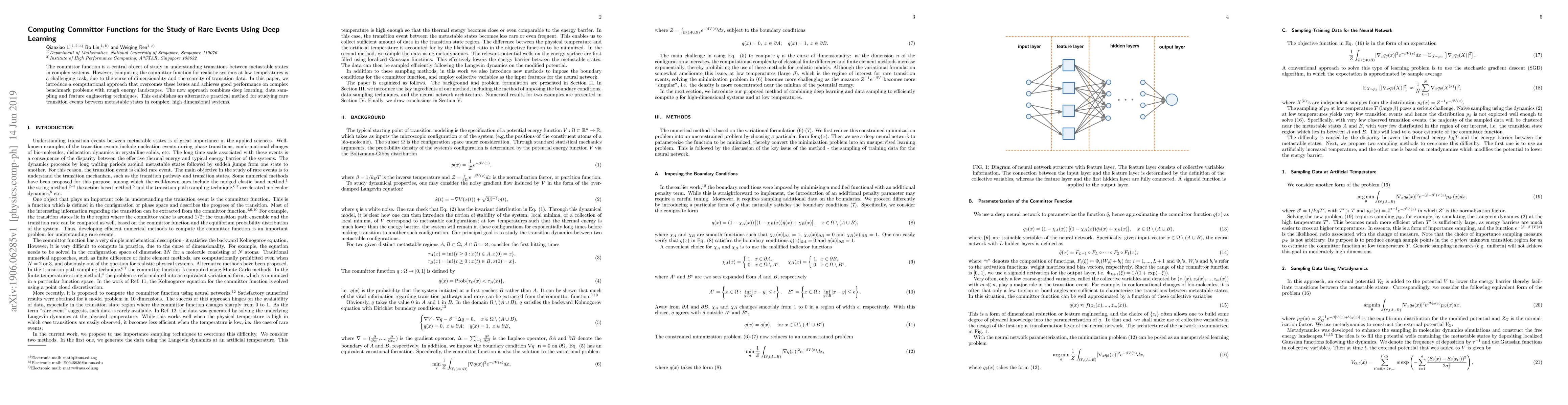 This paper presents a novel method using deep learning to compute committor functions for studying rare transition events in complex systems, overcoming the challenges of high dimensionality and limited data. The approach integrates data sampling and feature engineering, offering a practical alternative for analyzing metastable state transitions.