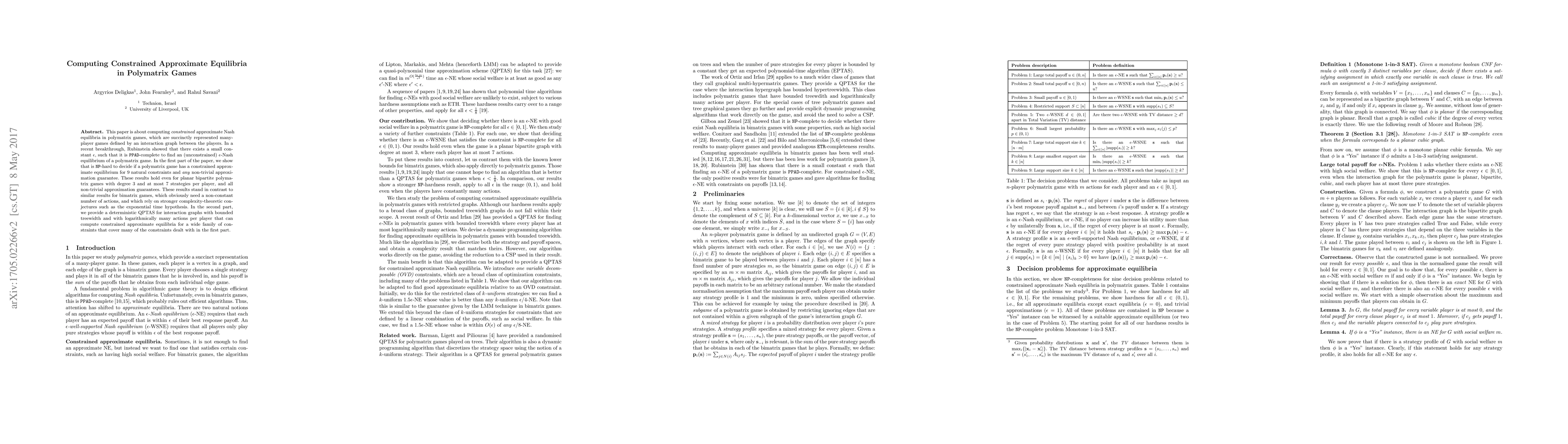 This paper investigates the computational complexity of finding constrained approximate Nash equilibria in polymatrix games, demonstrating NP-hardness for several natural constraints. It also presents a deterministic quasi-polynomial time approximation scheme (QPTAS) for specific graph structures with bounded treewidth.