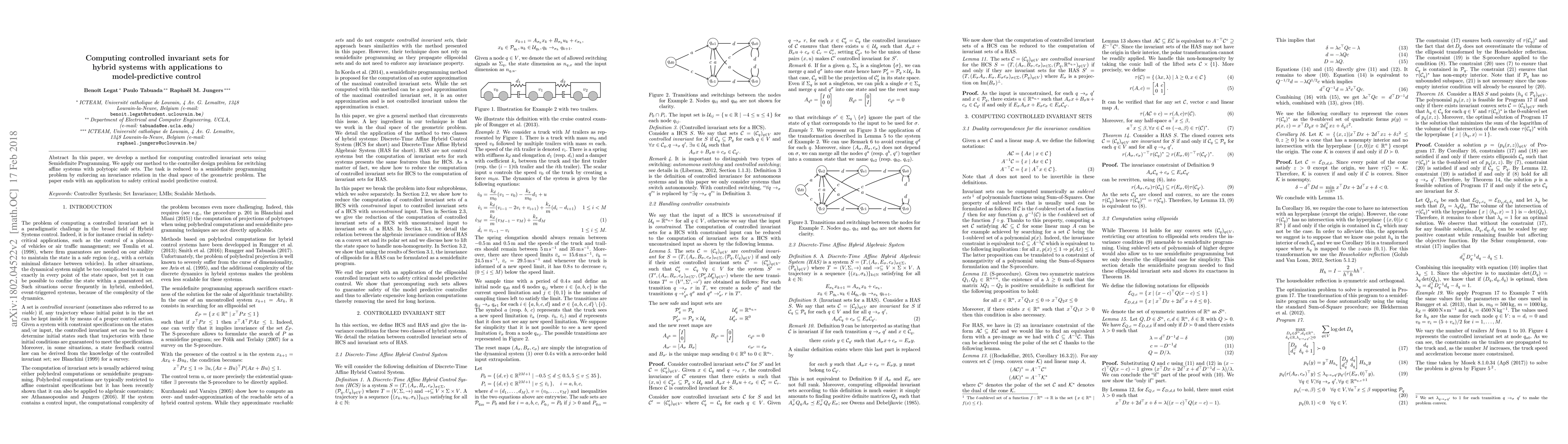 This paper presents a method for computing controlled invariant sets via Semidefinite Programming for hybrid systems, specifically applied to switching affine systems with polytopic safe sets. The approach reduces the controller design problem to a semidefinite programming problem, concluding with an application to safety-critical model predictive control.
