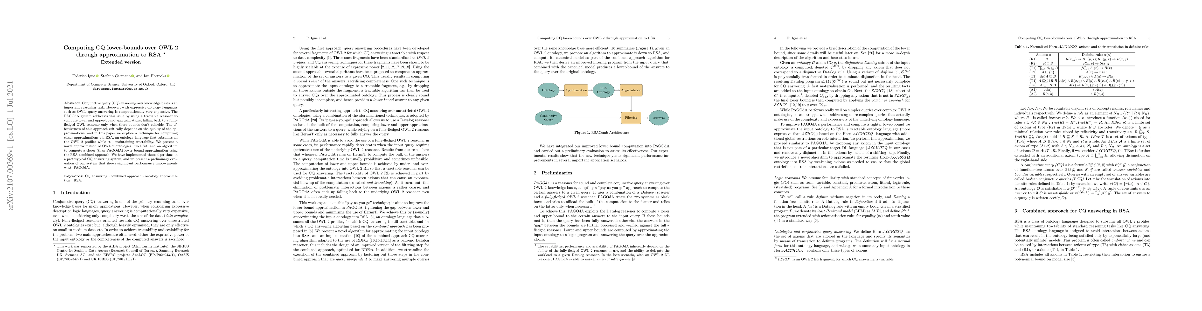 Conjunctive query (CQ) answering over knowledge bases is an important reasoning task. However, with expressive ontology languages such as OWL, query answering is computationally very expensive. The PAGOdA system addresses this issue by using a tractable reasoner to compute lower and upper-bound approximations, falling back to a fully-fledged OWL reasoner only when these bounds don't coincide. The effectiveness of this approach critically depends on the quality of the approximations, and in this paper we explore a technique for computing closer approximations via RSA, an ontology language that subsumes all the OWL 2 profiles while still maintaining tractability. We present a novel approximation of OWL 2 ontologies into RSA, and an algorithm to compute a closer (than PAGOdA) lower bound approximation using the RSA combined approach. We have implemented these algorithms in a prototypical CQ answering system, and we present a preliminary evaluation of our system that shows significant performance improvements w.r.t. PAGOdA.