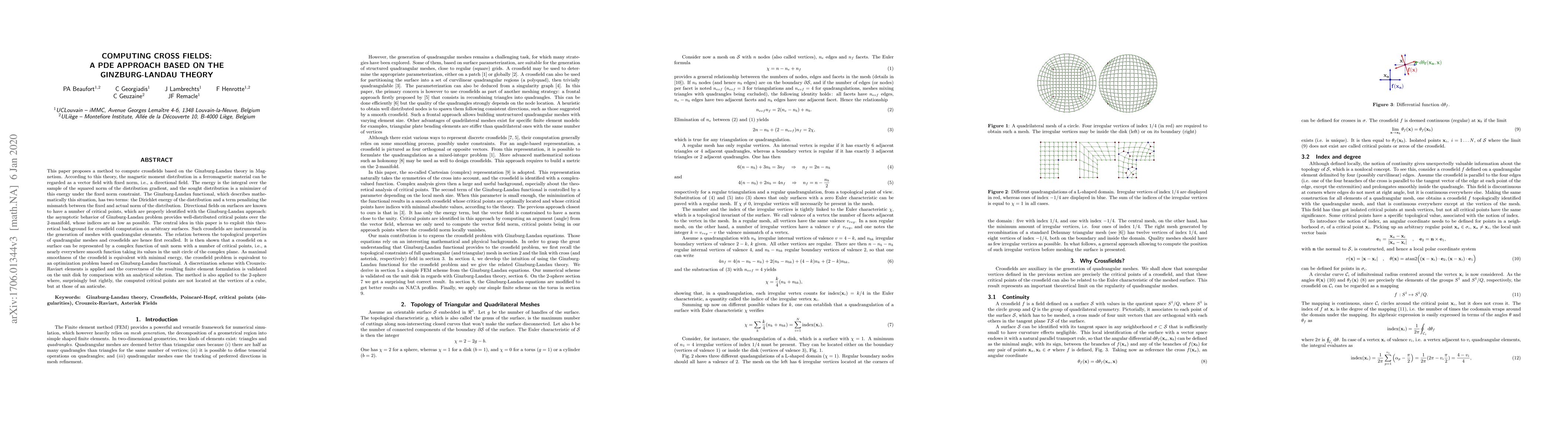 This paper proposes a method to compute crossfields based on the Ginzburg-Landau theory. The Ginzburg-Landau functional has two terms: the Dirichlet energy of the distribution and a term penalizing the mismatch between the fixed and actual norm of the distribution. Directional fields on surfaces are known to have a number of critical points, which are properly identified with the Ginzburg-Landau approach: the asymptotic behavior of Ginzburg-Landau problem provides well-distributed critical points over the 2-manifold, whose indices are as low as possible. The central idea in this paper is to exploit this theoretical background for crossfield computation on arbitrary surfaces. Such crossfields are instrumental in the generation of meshes with quadrangular elements. The relation between the topological properties of quadrangular meshes and crossfields are hence first recalled. It is then shown that a crossfield on a surface can be represented by a complex function of unit norm with a number of critical points, i.e., a nearly everywhere smooth function taking its values in the unit circle of the complex plane. As maximal smoothness of the crossfield is equivalent with minimal energy, the crossfield problem is equivalent to an optimization problem based on Ginzburg-Landau functional. A discretization scheme with Crouzeix-Raviart elements is applied and the correctness of the resulting finite element formulation is validated on the unit disk by comparison with an analytical solution. The method is also applied to the 2-sphere where, surprisingly but rightly, the computed critical points are not located at the vertices of a cube, but at those of an anticube.
