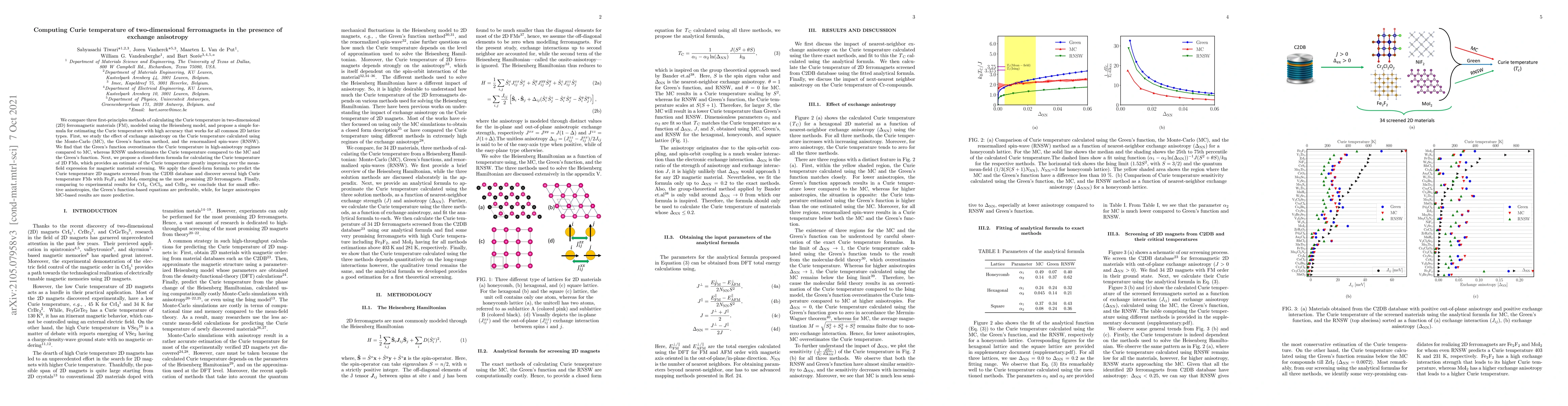 We compare three first-principles methods of calculating the Curie temperature in two-dimensional (2D) ferromagnetic materials (FM), modeled using the Heisenberg model, and propose a simple formula for estimating the Curie temperature with high accuracy that works for all common 2D lattice types. First, we study the effect of exchange anisotropy on the Curie temperature calculated using the Monte-Carlo (MC), the Green's function method, and the renormalized spin-wave (RNSW). We find that the Green's function overestimates the Curie temperature in high-anisotropy regimes compared to MC, whereas RNSW underestimates the Curie temperature compared to the MC and the Green's function. Next, we propose a closed-form formula for calculating the Curie temperature of 2D FMs, which provides an estimate of the Curie temperature greatly improving over the mean-field expression for magnetic material screening. We apply the closed-form formula to predict the Curie temperature 2D magnets screened from the C2DB database and discover several high Curie temperature FMs with Fe2F2 and MoI2 emerging as the most promising 2D ferromagnets. Finally, comparing to experimental results for CrI3, CrCl3, and CrBr3, we conclude that for small effective anisotropies, the Green's function-based equations are preferable, while, for larger anisotropies MC-based results are more predictive.