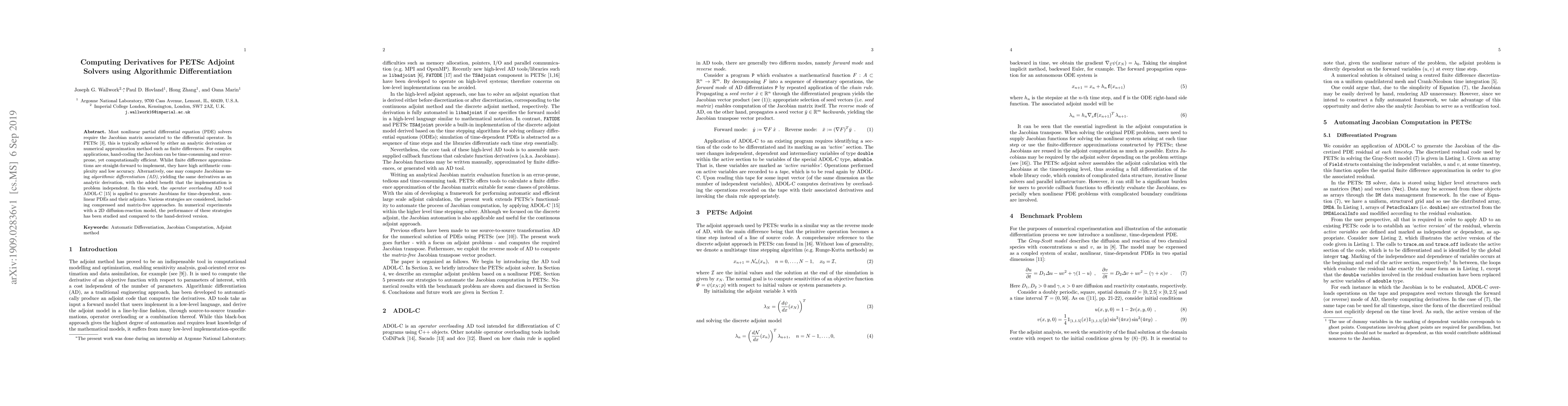 This paper explores the use of algorithmic differentiation (AD) via the ADOL-C tool to compute Jacobians for PETSc adjoint solvers, comparing it to traditional analytic and finite difference methods. The study finds AD to be more efficient and accurate for complex PDEs compared to numerical approximations.