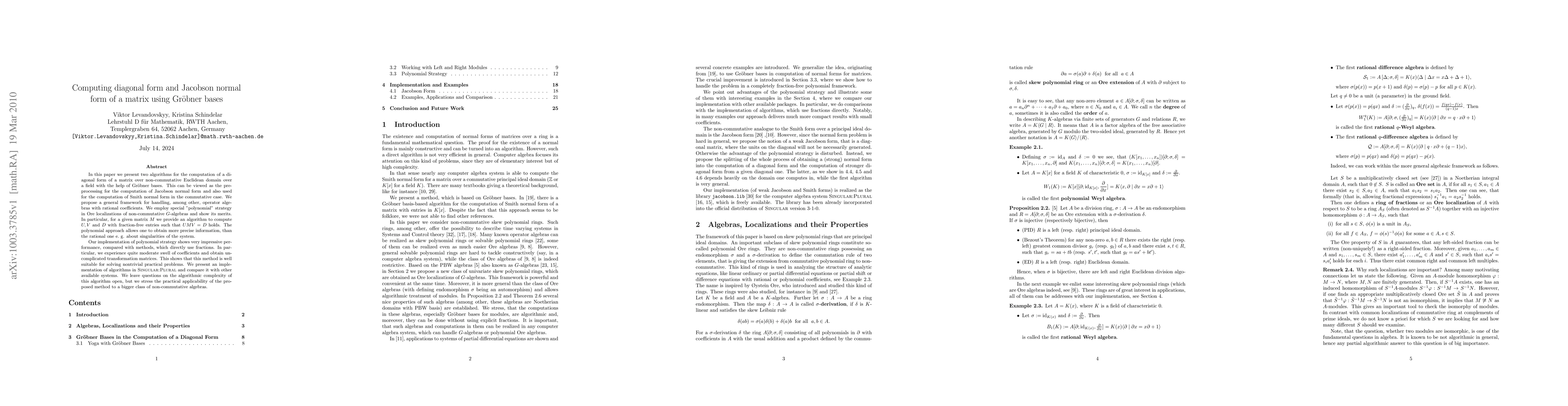 In this paper we present two algorithms for the computation of a diagonal form of a matrix over non-commutative Euclidean domain over a field with the help of Gr\"obner bases. This can be viewed as the pre-processing for the computation of Jacobson normal form and also used for the computation of Smith normal form in the commutative case. We propose a general framework for handling, among other, operator algebras with rational coefficients. We employ special "polynomial" strategy in Ore localizations of non-commutative $G$-algebras and show its merits. In particular, for a given matrix $M$ we provide an algorithm to compute $U,V$ and $D$ with fraction-free entries such that $UMV=D$ holds. The polynomial approach allows one to obtain more precise information, than the rational one e. g. about singularities of the system. Our implementation of polynomial strategy shows very impressive performance, compared with methods, which directly use fractions. In particular, we experience quite moderate swell of coefficients and obtain uncomplicated transformation matrices. This shows that this method is well suitable for solving nontrivial practical problems. We present an implementation of algorithms in SINGULAR:PLURAL and compare it with other available systems. We leave questions on the algorithmic complexity of this algorithm open, but we stress the practical applicability of the proposed method to a bigger class of non-commutative algebras.