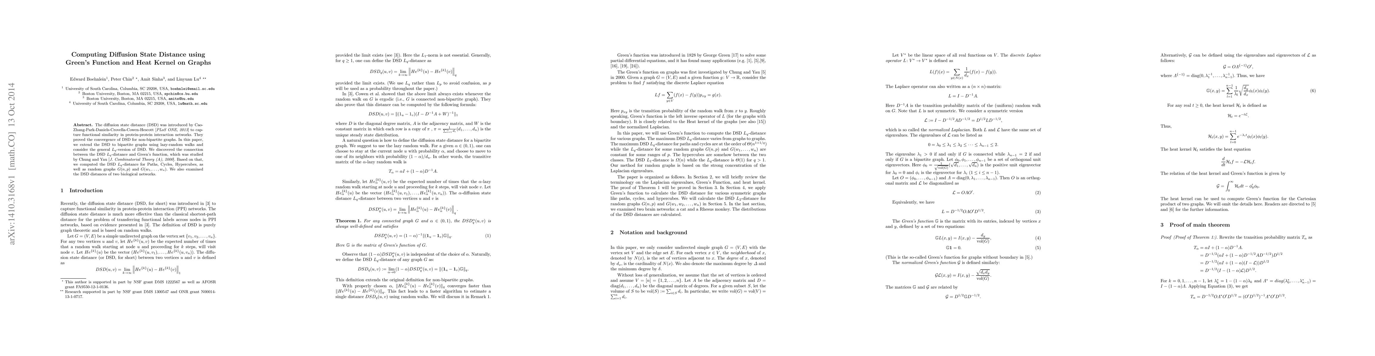 The diffusion state distance (DSD) was introduced by Cao-Zhang-Park-Daniels-Crovella-Cowen-Hescott [{\em PLoS ONE, 2013}] to capture functional similarity in protein-protein interaction networks. They proved the convergence of DSD for non-bipartite graphs. In this paper, we extend the DSD to bipartite graphs using lazy-random walks and consider the general $L_q$-version of DSD. We discovered the connection between the DSD $L_q$-distance and Green's function, which was studied by Chung and Yau [{\em J. Combinatorial Theory (A), 2000}]. Based on that, we computed the DSD $L_q$-distance for Paths, Cycles, Hypercubes, as well as random graphs $G(n,p)$ and $G(w_1,..., w_n)$. We also examined the DSD distances of two biological networks.