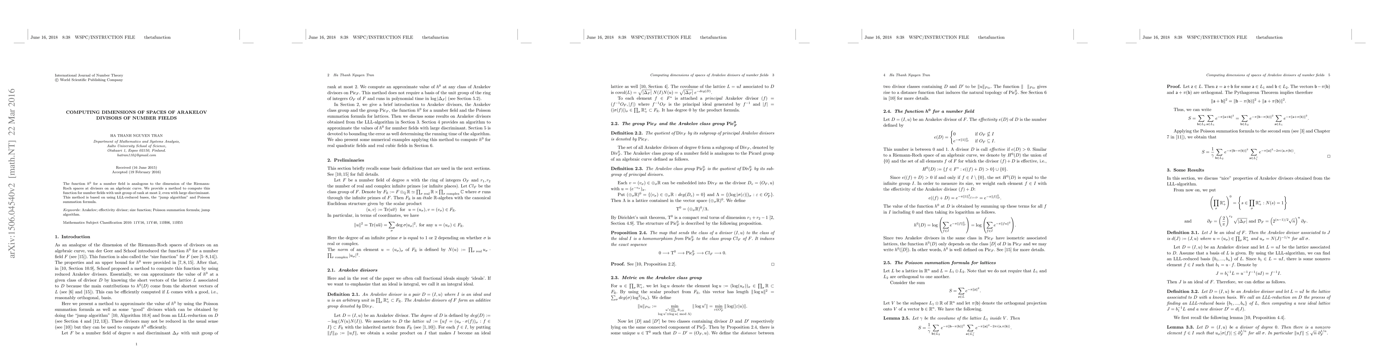 This paper presents a method to compute the dimension function $h^0$ for number fields, analogous to Riemann-Roch spaces on algebraic curves, using LLL-reduced bases, the "jump algorithm," and Poisson summation, applicable even for fields with large discriminants and unit group rank up to 2.