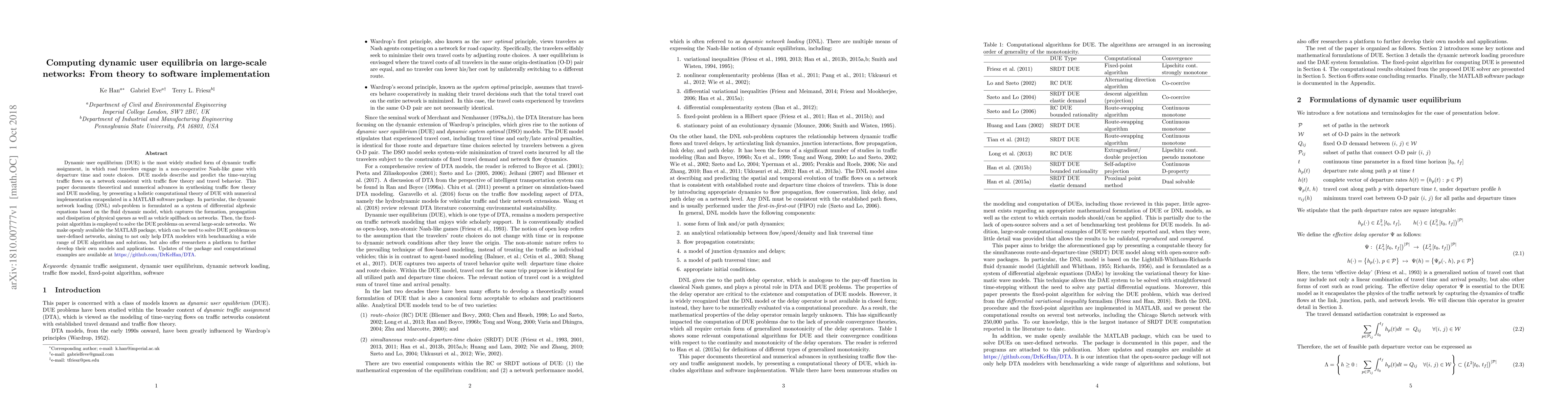 Dynamic user equilibrium (DUE) is the most widely studied form of dynamic traffic assignment, in which road travelers engage in a non-cooperative Nash-like game with departure time and route choices. DUE models describe and predict the time-varying traffic flows on a network consistent with traffic flow theory and travel behavior. This paper documents theoretical and numerical advances in synthesizing traffic flow theory and DUE modeling, by presenting a holistic computational theory of DUE with numerical implementation encapsulated in a MATLAB software package. In particular, the dynamic network loading (DNL) sub-problem is formulated as a system of differential algebraic equations based on the fluid dynamic model, which captures the formation, propagation and dissipation of physical queues as well as vehicle spillback on networks. Then, the fixed-point algorithm is employed to solve the DUE problems on several large-scale networks. We make openly available the MATLAB package, which can be used to solve DUE problems on user-defined networks, aiming to not only help DTA modelers with benchmarking a wide range of DUE algorithms and solutions, but also offer researchers a platform to further develop their own models and applications. Updates of the package and computational examples are available at https://github.com/DrKeHan/DTA.