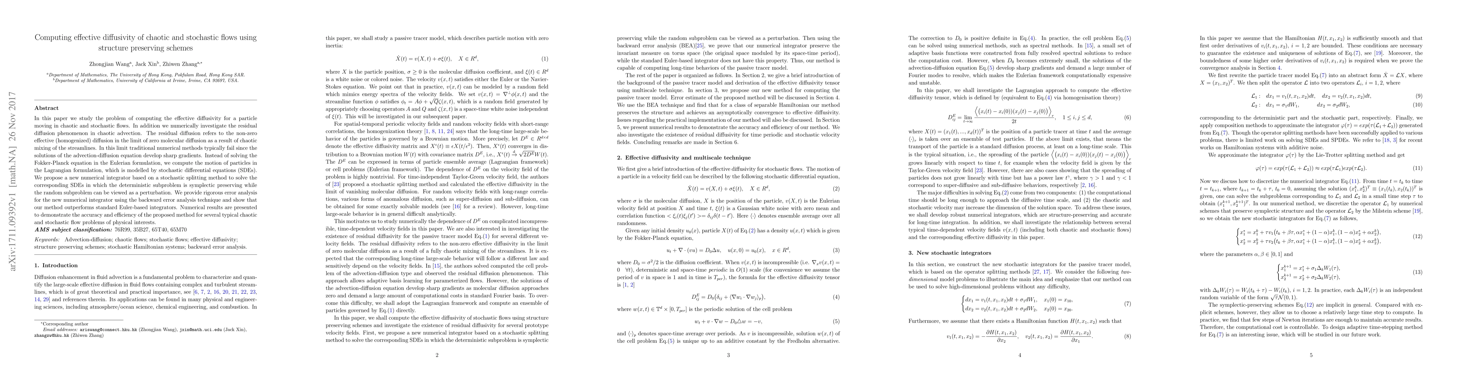 In this paper we study the problem of computing the effective diffusivity for a particle moving in chaotic and stochastic flows. In addition we numerically investigate the residual diffusion phenomenon in chaotic advection. The residual diffusion refers to the non-zero effective (homogenized) diffusion in the limit of zero molecular diffusion as a result of chaotic mixing of the streamlines. In this limit traditional numerical methods typically fail since the solutions of the advection-diffusion equation develop sharp gradients. Instead of solving the Fokker-Planck equation in the Eulerian formulation, we compute the motion of particles in the Lagrangian formulation, which is modelled by stochastic differential equations (SDEs). We propose a new numerical integrator based on a stochastic splitting method to solve the corresponding SDEs in which the deterministic subproblem is symplectic preserving while the random subproblem can be viewed as a perturbation. We provide rigorous error analysis for the new numerical integrator using the backward error analysis technique and show that our method outperforms standard Euler-based integrators. Numerical results are presented to demonstrate the accuracy and efficiency of the proposed method for several typical chaotic and stochastic flow problems of physical interests.
