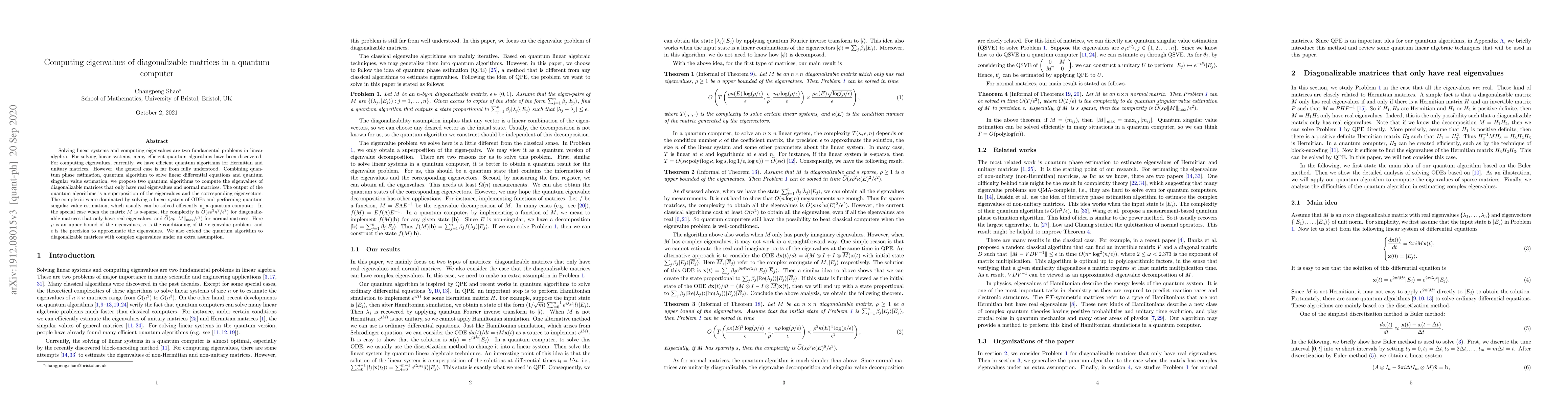 This paper proposes quantum algorithms for computing eigenvalues of diagonalizable matrices with real eigenvalues and normal matrices using quantum phase estimation and other techniques. The algorithms yield a superposition of eigenvalues and eigenvectors, with complexities dominated by solving linear systems of ODEs and quantum singular value estimation, which are efficiently solvable on a quantum computer.