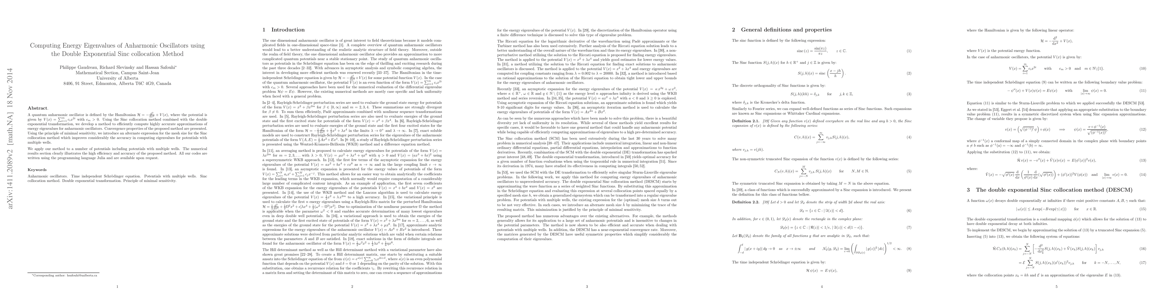 This paper presents a novel method using the double exponential Sinc collocation method to compute energy eigenvalues for quantum anharmonic oscillators. The approach demonstrates high accuracy and efficiency, especially for potentials with multiple wells, and is implemented in Julia.