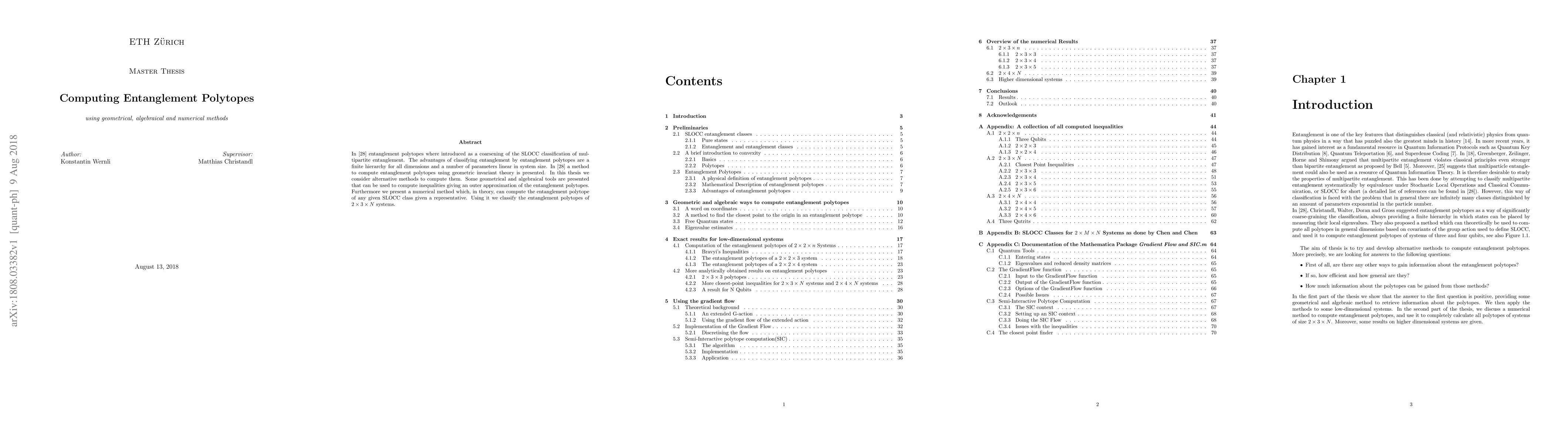 In arXiv:1208.0365 entanglement polytopes where introduced as a coarsening of the SLOCC classification of multipartite entanglement. The advantages of classifying entanglement by entanglement polytopes are a finite hierarchy for all dimensions and a number of parameters linear in system size. In arXiv:1208.0365 a method to compute entanglement polytopes using geometric invariant theory is presented. In this thesis we consider alternative methods to compute them. Some geometrical and algebraical tools are presented that can be used to compute inequalities giving an outer approximation of the entanglement polytopes. Furthermore we present a numerical method which, in theory, can compute the entanglement polytope of any given SLOCC class given a representative. Using it we classify the entanglement polytopes of $2 \times 3 \times N$ systems.